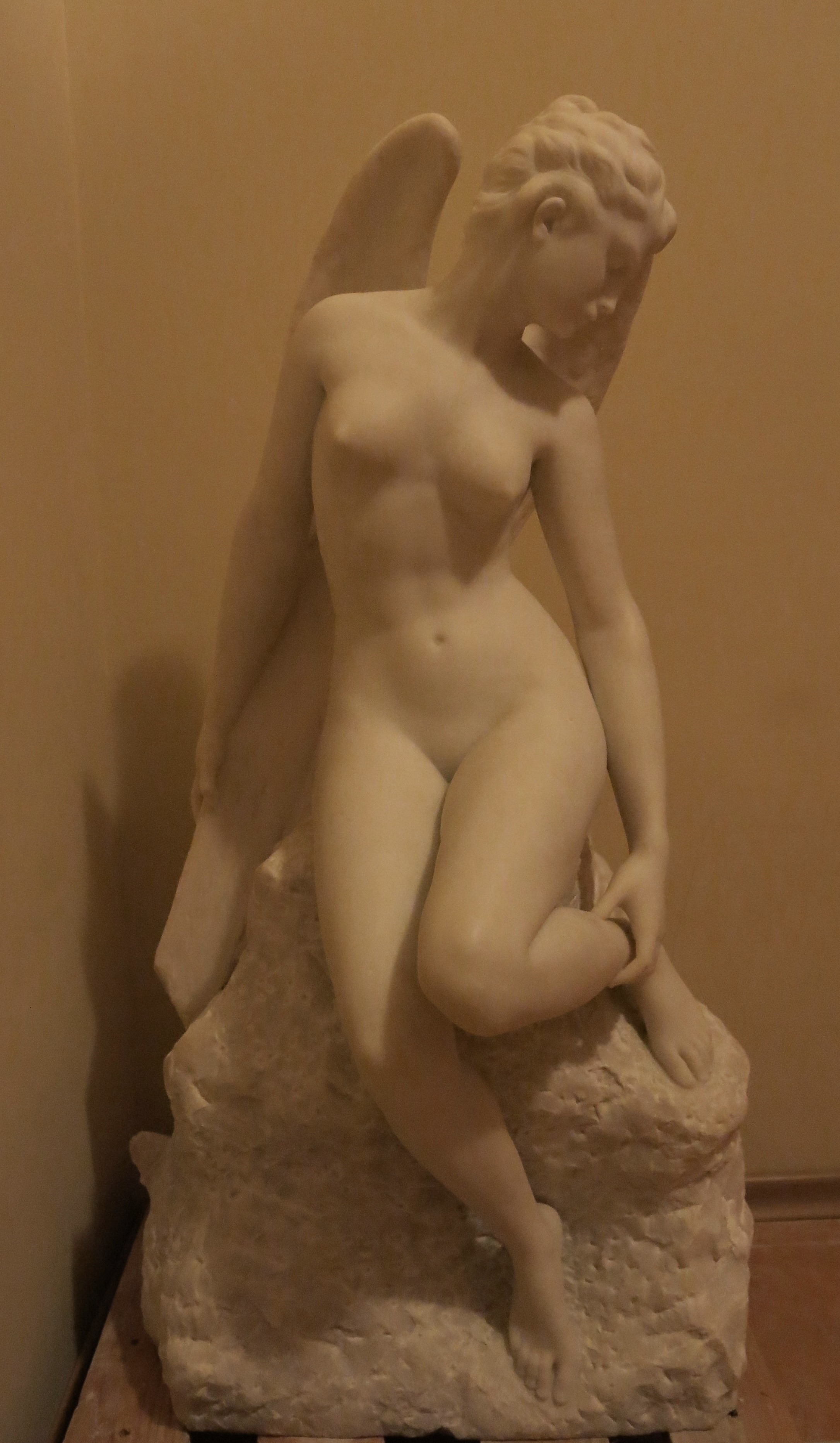 Кількість: 1/Опис: Молода оголена дівчина з довгими крилами присіла на скелю. Повернувши голову вліво, вона дивиться вниз. Однією рукою вона підтримує поставлену на виступ скелі ногу, другою - торкається крила. Волосся її зібране у скромну зачіску.
