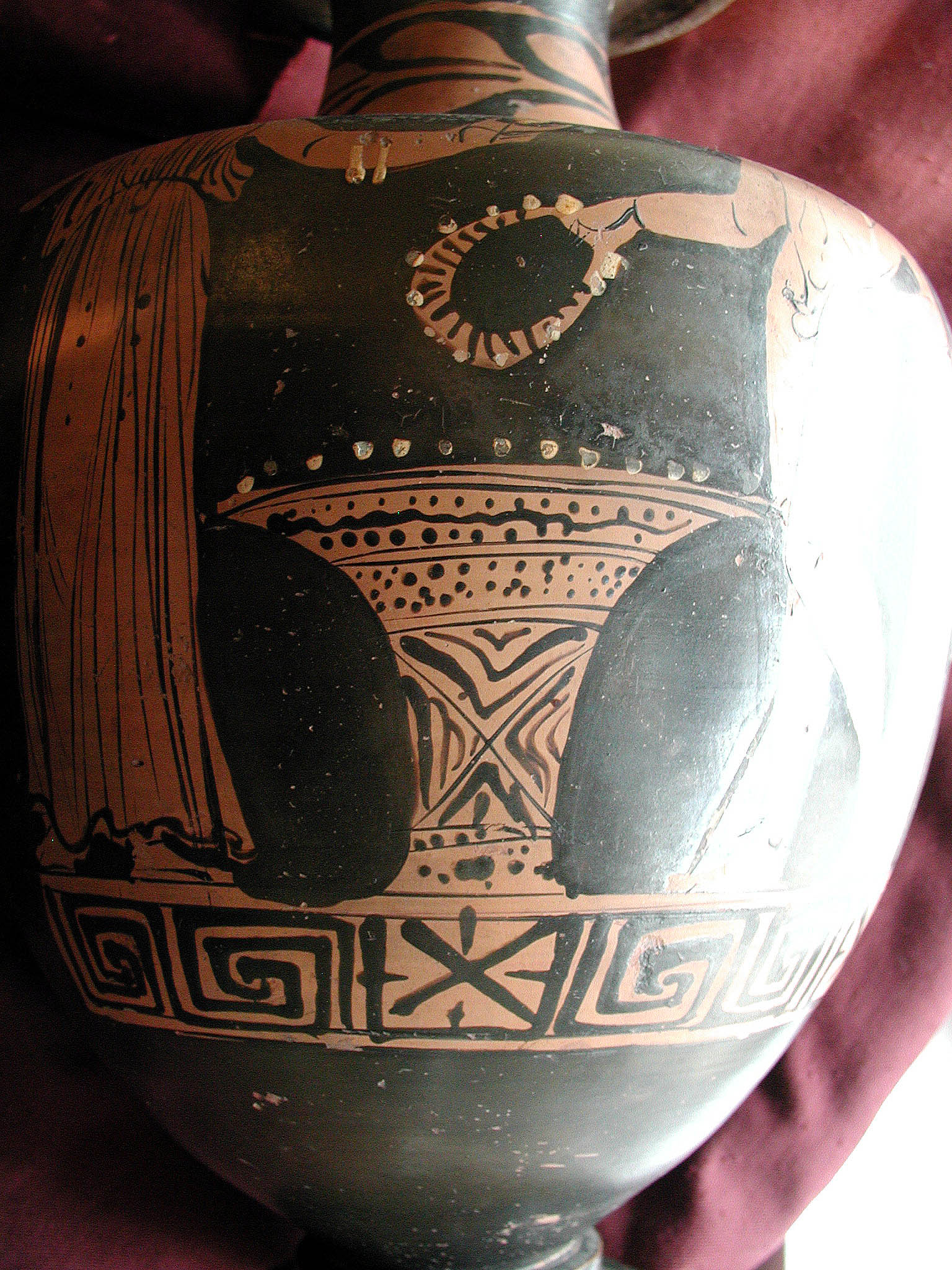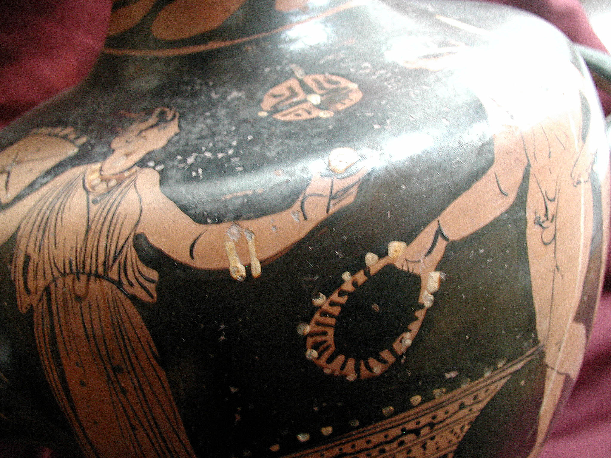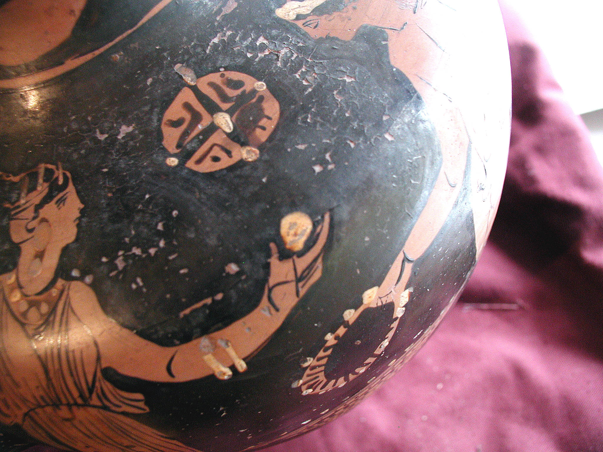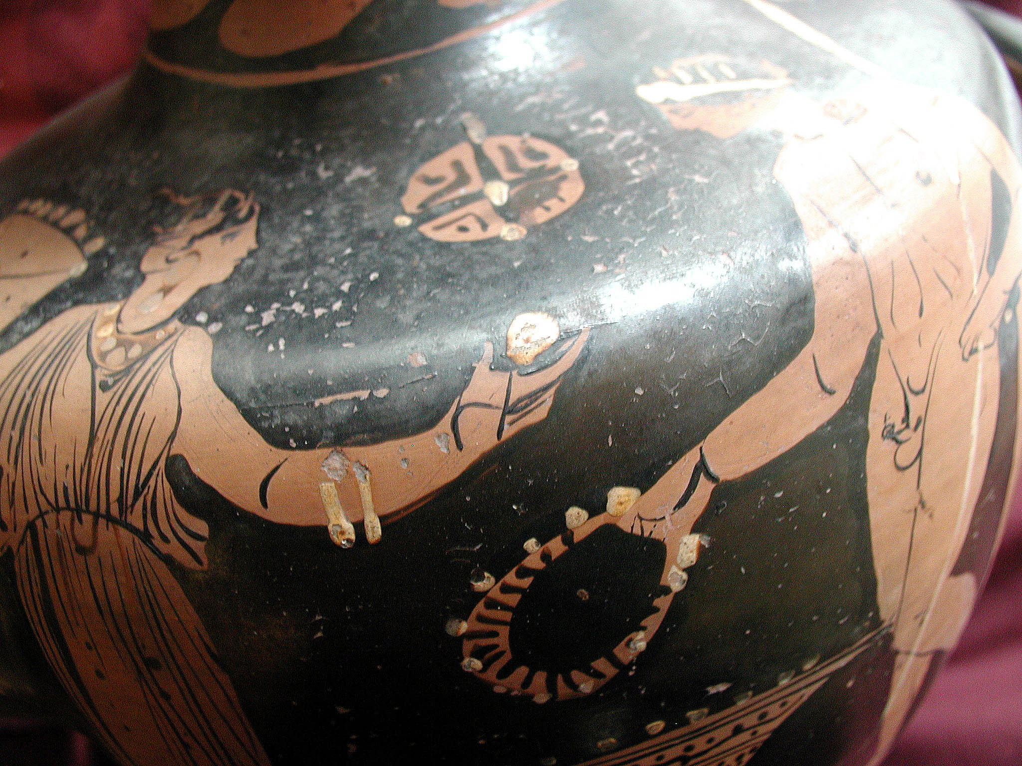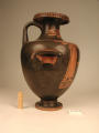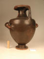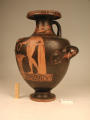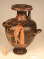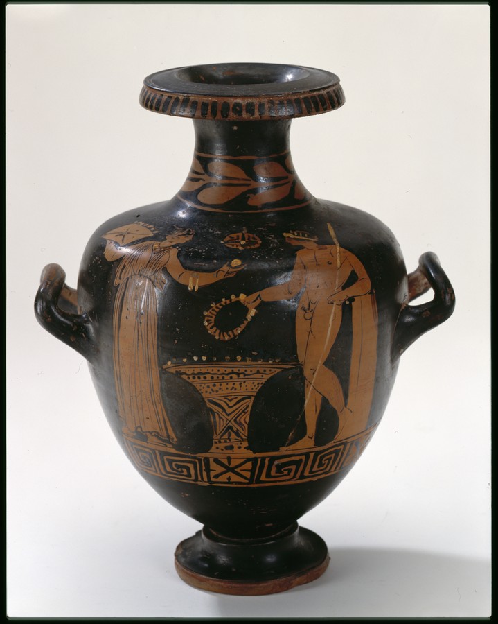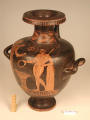 2002 р. (?), Швейцарія (????) - Тарент, перша половина 4 ст. до н.е./Кількість: 1/Старі документи прийому: старі документи прийому у чинній інвентарній книзі не вказані/Опис: В лицьовій частині корпуса зображені у жертовника (?) оголений юнак з пов'язкою на голові і дівчина. Спираючись правою рукою на тумбу, він тримає у ній списа. Інша його рука простягнута над жертовником у бік дівчини, яка в свою чергу подає йому яблуко. В іншій руці дівчини чотирикутний предмет. Між їхніми обличчями заповнювальний мотив у вигляді розетки. Під зображенням меандровий візерунок, що переривається у двох місцях перехрещеними лініями. На шийці, між двома лініями, зображена оливкова гілка. Відігнутий край горла гідрії прикрашений вертикальними смужками.