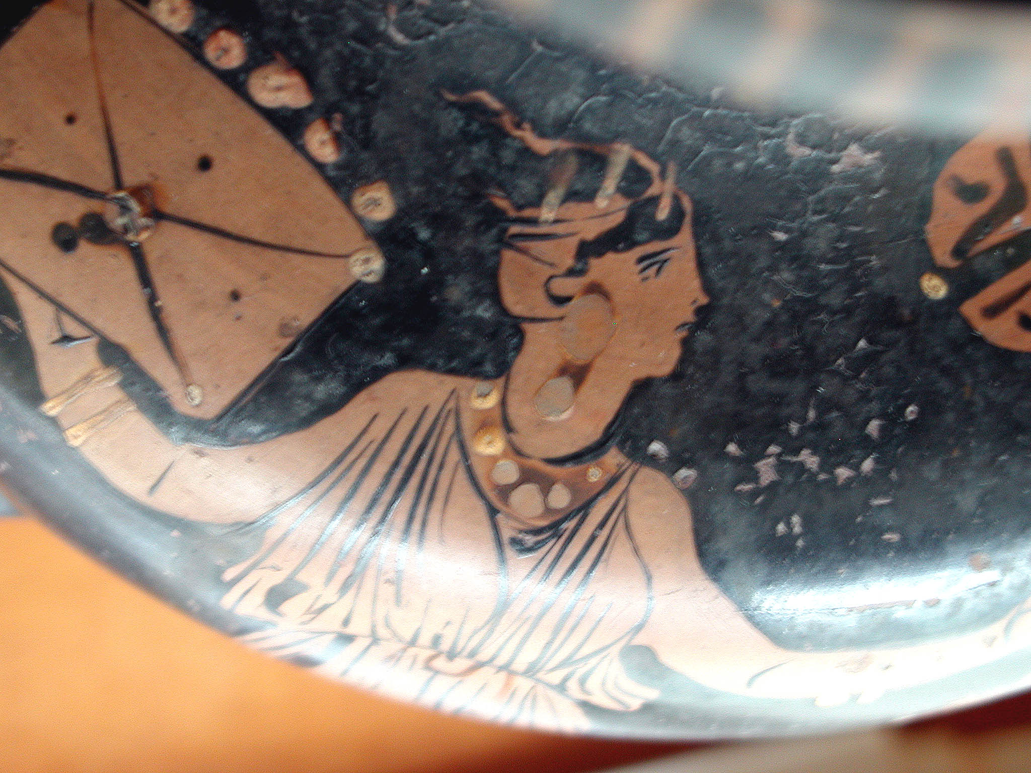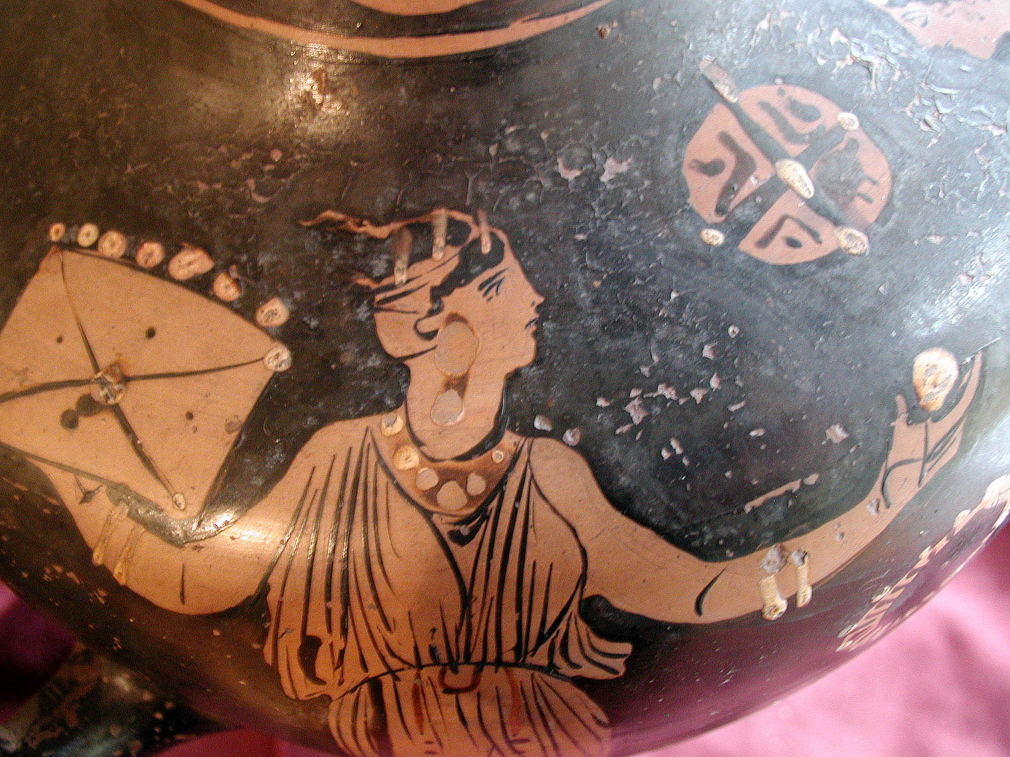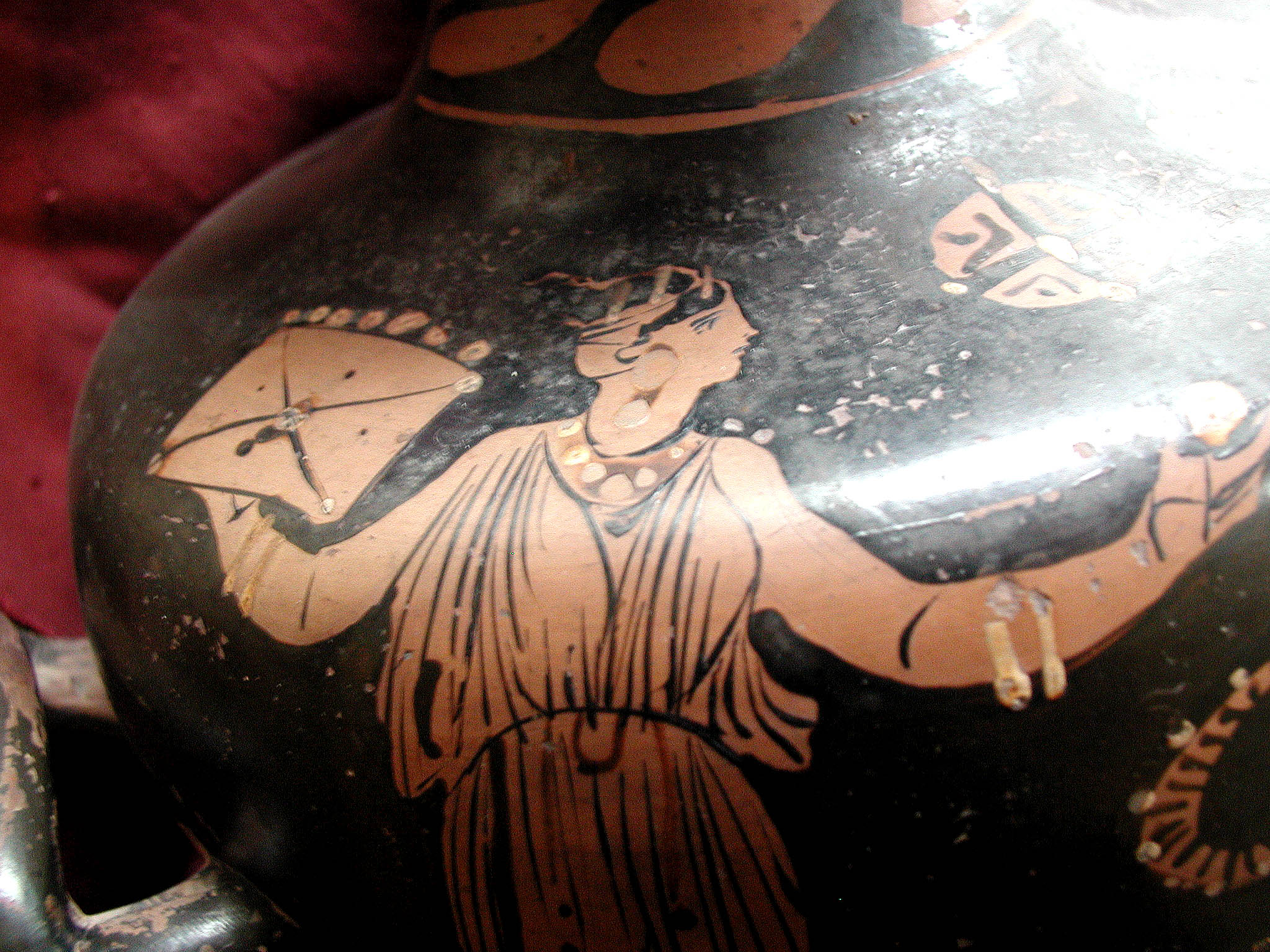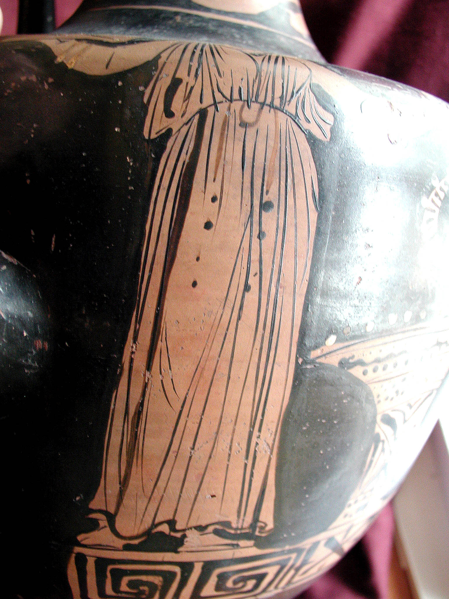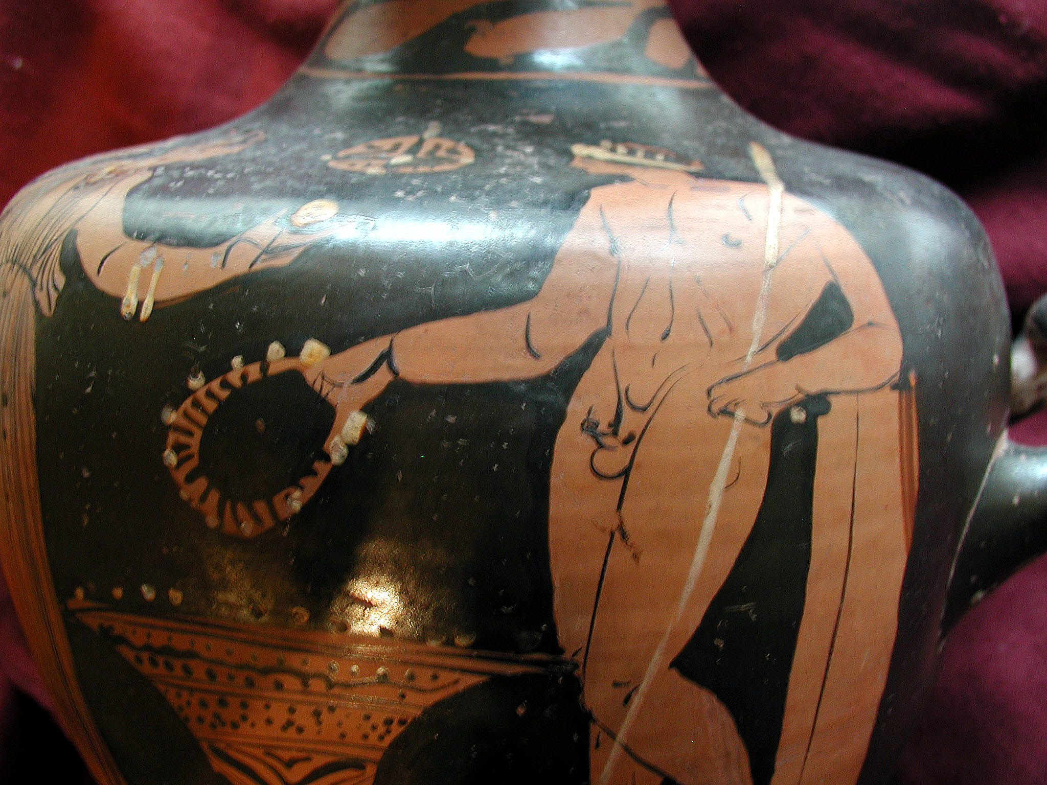 2002 р. (?), Швейцарія (????) - Тарент, перша половина 4 ст. до н.е./Кількість: 1/Старі документи прийому: старі документи прийому у чинній інвентарній книзі не вказані/Опис: В лицьовій частині корпуса зображені у жертовника (?) оголений юнак з пов'язкою на голові і дівчина. Спираючись правою рукою на тумбу, він тримає у ній списа. Інша його рука простягнута над жертовником у бік дівчини, яка в свою чергу подає йому яблуко. В іншій руці дівчини чотирикутний предмет. Між їхніми обличчями заповнювальний мотив у вигляді розетки. Під зображенням меандровий візерунок, що переривається у двох місцях перехрещеними лініями. На шийці, між двома лініями, зображена оливкова гілка. Відігнутий край горла гідрії прикрашений вертикальними смужками.