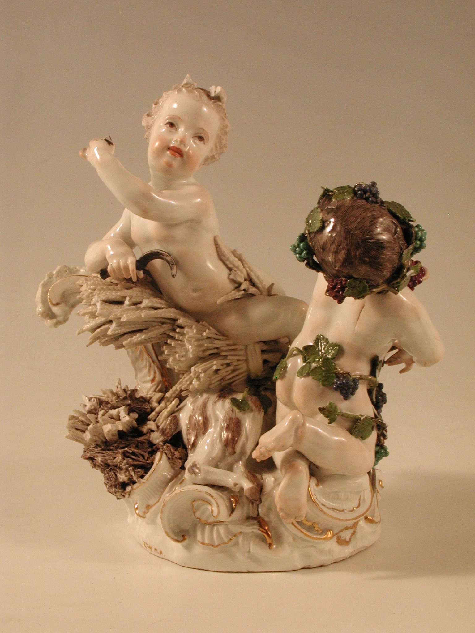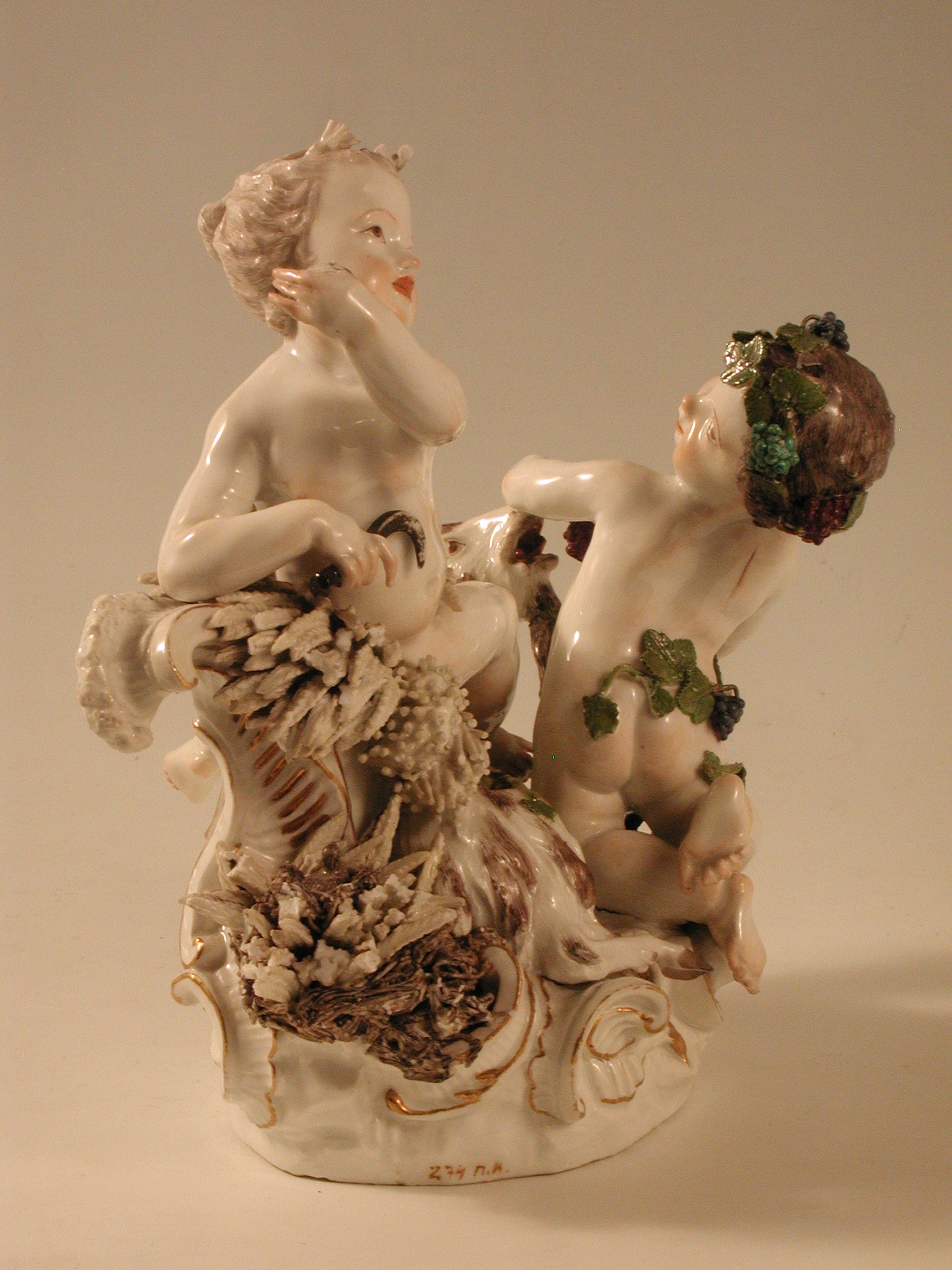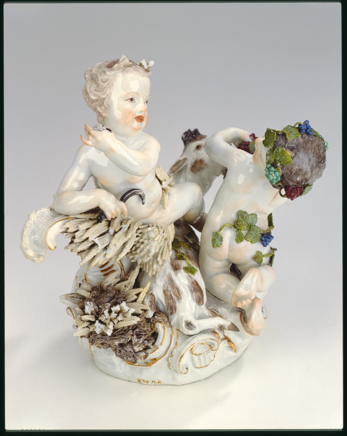 Закладка “Атрибуція” - Наим. предмета, издания: Літо та Осінь/Змiн. розміри: висота 23,7/Змiн.информацiя об оригiнале: автор моделі І.І. Кендлер (та Ф.Е. Мейєра ?) сер. 18 ст. Форма № 1730/Змiн. Написи, клейма, марки: Марка синя підглазурна (на підніжжі ззаду): схрещені мечі./Змiн.опис: Літо та Осінь - у вигляді двох дітей. Літо - світловолоса дівчинка з серпом у правій руці, яка лежить на завитку рокайль із снопом колосся. Осінь - темноволосий хлопчик, голова та стегна якого обвиті виноградною лозою; у його лівій руці гроно винограду, до якого тягнеться козел, що лежить між фігурами дітей, біля його задніх лап - гніздо з птахом. Підніжжя з рельєфними з золотом рокайлями./Змiн. час створення: 1740 - 1750місце створення, школа: Королівська порцелянова мануфактураНовый материал: порцелянаИзм. техника: надглазурний поліхромний розписИзм. техника: золочення