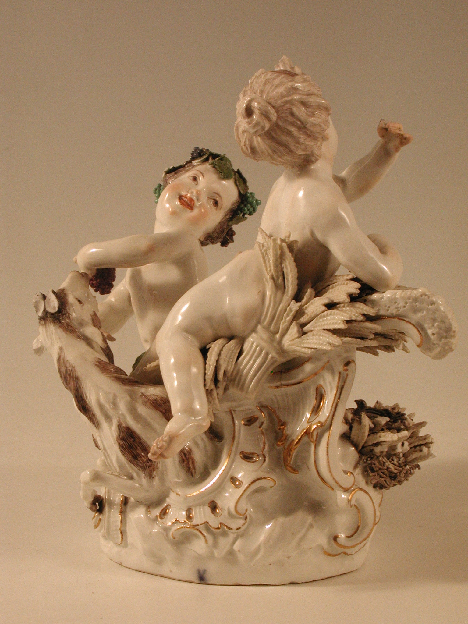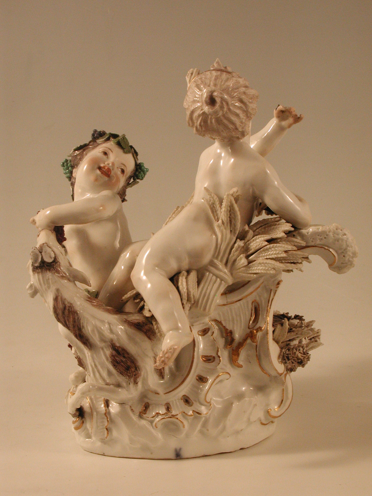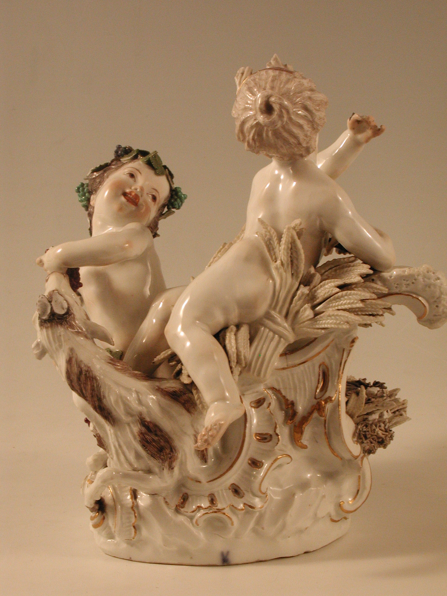 Закладка “Атрибуція” - Наим. предмета, издания: Літо та Осінь/Змiн. розміри: висота 23,7/Змiн.информацiя об оригiнале: автор моделі І.І. Кендлер (та Ф.Е. Мейєра ?) сер. 18 ст. Форма № 1730/Змiн. Написи, клейма, марки: Марка синя підглазурна (на підніжжі ззаду): схрещені мечі./Змiн.опис: Літо та Осінь - у вигляді двох дітей. Літо - світловолоса дівчинка з серпом у правій руці, яка лежить на завитку рокайль із снопом колосся. Осінь - темноволосий хлопчик, голова та стегна якого обвиті виноградною лозою; у його лівій руці гроно винограду, до якого тягнеться козел, що лежить між фігурами дітей, біля його задніх лап - гніздо з птахом. Підніжжя з рельєфними з золотом рокайлями./Змiн. час створення: 1740 - 1750місце створення, школа: Королівська порцелянова мануфактураНовый материал: порцелянаИзм. техника: надглазурний поліхромний розписИзм. техника: золочення