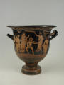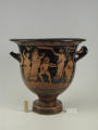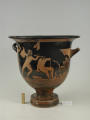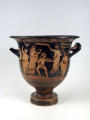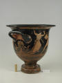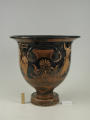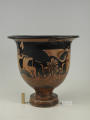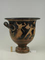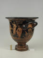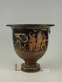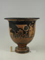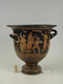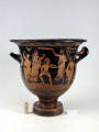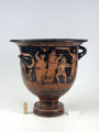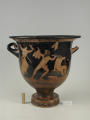 Додаток до назва (лист, ...): На одному боці корпуса зображена вакханка в гіматії з ритоном у вигляді рогу в одній руці і довгим тірсом в другій. Дещо нахиливши корпус вперед, вона прямує до бородатого фавна. Фавн, зробивши різкий випад назад, тримає в одній руці блюдо з виноградною китицею, а другій міх з вином. Праворуч, спиною до них сидить ще один фавн, спираючись на палицю. На другому боці посудини зображено п'ять фігур. З двох боків композицію замикають фігури напівоголених чоловіка і жінки з жезлами в руках. Ближче до центра дві інші фігури в нарядних плащах перекинутих через ліву руку: ліворуч жінка, яка грає на подвійній флейті, праворуч - бородатий чоловік з піднятою рукою. В центрі, між ними, воїн у шоломі зі щитом і списом. Широко розставивши повернуті в різні боки ноги, він приготувався до захисту. Під зображенням навколо чаші - меандровий візерунок. Під ручками візерунок з пальметок. Біля місця кріплення ручок до корпуса візерунок з овів. По зовнішній стороні краю чаші орнамент у вигляді гілки з листям, по внутрішній стороні проходять дві резервні смужки./Авторські підписи, клейма: Авторських підписів і написів на експонаті немає./Комм.: Коментар в закладинці "Опис": поки що не знаю, що тут написати :)/Історія Атрибуціi: Історія атрибуції: ...../Кількість: 1/Старі документи прийому: старі документи прийому у чинній інвентарній книзі не вказані/Історія предмета, легенда: Згідно з чинною інвентарною книгою: "Знайдений в кургані скіфського часу між с. Піщальники і Лазурці Канівського р-на Київської обл. в 1845 р."./Опис: На одному боці корпуса зображена вакханка в гіматії з ритоном у вигляді рогу в одній руці і довгим тірсом в другій. Дещо нахиливши корпус вперед, вона прямує до бородатого фавна. Фавн, зробивши різкий випад назад, тримає в одній руці блюдо з виноградною китицею, а другій міх з вином. Праворуч, спиною до них сидить ще один фавн, спираючись на палицю. На другому боці посудини зображено п'ять фігур. З двох боків композицію замикають фігури напівоголених чоловіка і жінки з жезлами в руках. Ближче до центра дві інші фігури в нарядних плащах перекинутих через ліву руку: ліворуч жінка, яка грає на подвійній флейті, праворуч - бородатий чоловік з піднятою рукою. В центрі, між ними, воїн у шоломі зі щитом і списом. Широко розставивши повернуті в різні боки ноги, він приготувався до захисту. Під зображенням навколо чаші - меандровий візерунок. Під ручками візерунок з пальметок. Біля місця кріплення ручок до корпуса візерунок з овів. По зовнішній стороні краю чаші орнамент у вигляді гілки з листям, по внутрішній стороні проходять дві резервні смужки./ншi написи, штампи, печатки, етикетки, наклейки: Наклейки: прямокутна наклейка з білого паперу у блакитній облямівці з написом номеру від руки чорнилом: "№ 463" (або № 763?)./Зв'язок з іншими предм. музею: Зв'язок з іншими предметами: Кратер був знайдений у тому ж кургані скіфського часу, що й бронзова ойнохойя № ... АТК./Час знахідки: 1845 р.