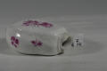 Закладка “Атрибуція” - Змiн. Написи, клейма, марки: Мара синя підглазурна: скіпетр. В тісті: III/Змiн.опис: Чайниця (без кришкм) грушоподібної форми з чотирма гранями, кожна з яких обрамлена рельєфними рокайлями та гілками; розпис пурпуром: на широких гранях - букети, один з яких з великою гвоздикою, інший - з трояндою, на вузьких гранях - по дві гілочки з квітами.Изм. техника: розпис пурпуром надглазурний
