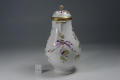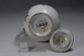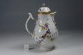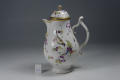Додаток до назва (лист, ...): грушоподібний; розпис: легкі гірлянди квітів, підхоплені двома пурпурними бантами, пропущеними крізь золоті кільця та дві пташки, які сидять на гірляндах; по краю горла та кришки - відводка золотом./Комм.: Продукція цієї мануфактури займає собливе місце серед інших підприємств Тюрінгії 18 ст. На відміну від інших порцелянових підприємств Тюрінгії, які належали приватним підприємцям, фейльсдорфська фабрика знаходилась у власності принца Фридріха-Вільгельма-Євгенія з дому Саксен-Хільдбургхаузенів, який її заснував. Фінансове положення мануфактури було нестабілбне. У 1791 р. вона була здана в аренду, а у 1795 р. помер її засновник принц Євгеній. У 1797 р. мануфактуру було передано власникам лімбахської фабрики у Рауенштейні. Вироби мануфактури вирізнялись високим художнім рівнем. З перших днів свого існування вона виробляла чудову пластику, посуд та багато різноманітних виробів - вази, настільні прикраси, підсвічники, чорнильниці, табакерки./Історія Атрибуціi: Консультація Соловєйчік Р.С. (Ермітаж, 1961 р.) - Тюрінгія, Клостер-Фейльсдорф, бл. 1770 - их рр. (глечик або чайник для окропу)/Кількість: 1/Старі документи прийому: передано з сектору російського та українського мистецтва (зараз Музей російського мистецтва) до сектору західного та східного мистецтва Державного художнього музею (дело № 6. Ед. хр. № 44, опись № 1)/Зв'язок з іншими предм. музею: до предметів 9-ПК МХ - 14-ПК МХ
