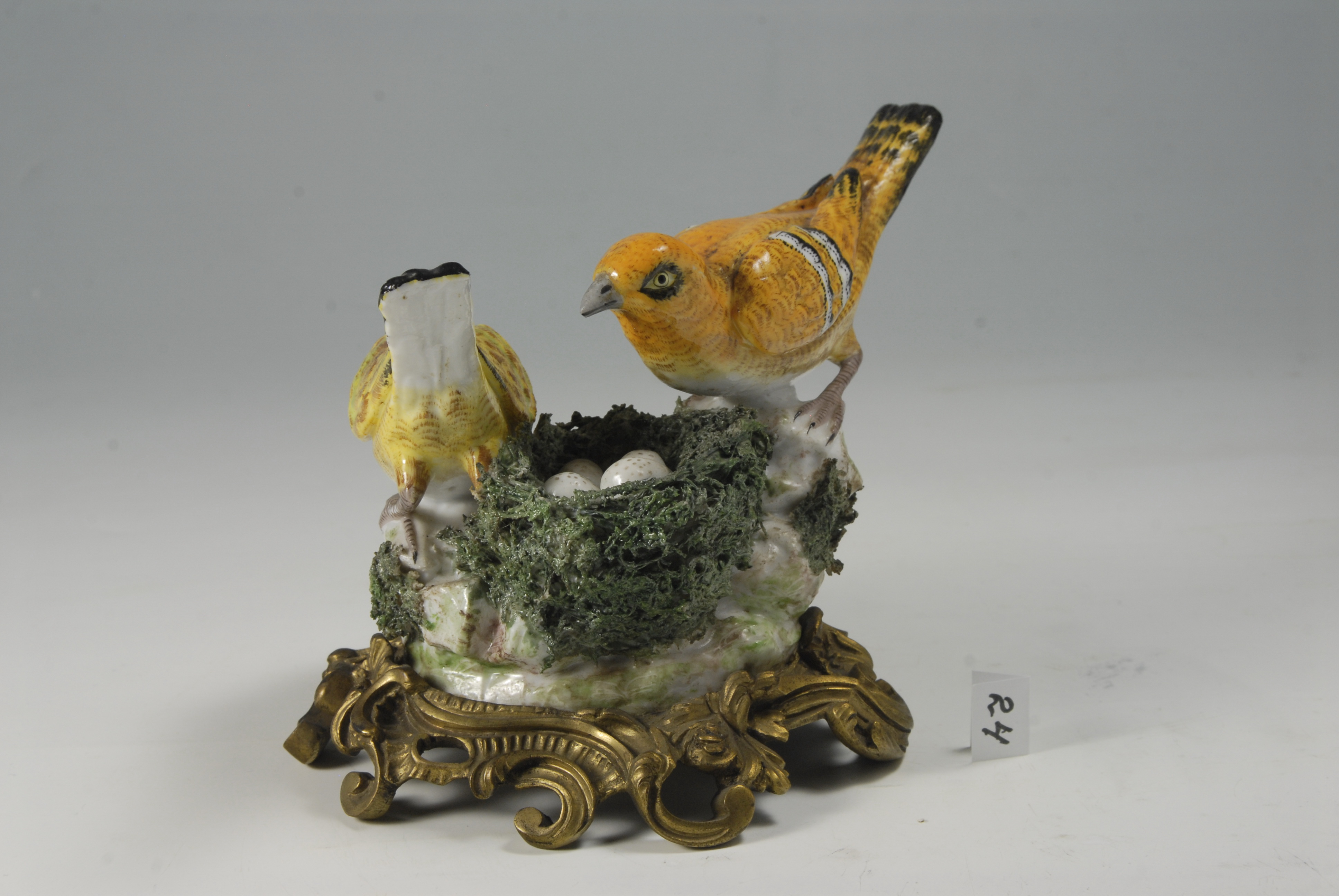 Додаток до назва (лист, ...): Дві пташки з жовтим оперенням сидять на краю гнізда з чотирма яєчками; підстака бронзова у вигляді картуша./Авторські підписи, клейма: марка/Історія Атрибуціi: Консультація Соловєйчік Р.С. (Ермітаж, 1961 р.) - фальшивий Хехст/Кількість: 1