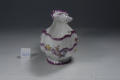 Авторські підписи, клейма: Марка./Комм.: Виробництво порцеляни у Франкенталі (Пфальц) розпочалось у 1755 р. видатним керамістом та живописцем П.-А. Ханнонгом (Paul Antoine Hannong). Сімя гончарів Ханнонгів у Страсбурзі заснувала фабрику фаянса, вироби якої користувались в Європі великим визнанням. Павло Ханнонг знав таємницю виробництва порцеляни від утікача з Мейсену. Коли в 1754 р. було введено монополію на виробництво порцеляни в Севрі, Ханнонг переніс своє порцелянове підприємство до Франкенталя. У 1759 р. Ханнонг продав мануфактуру своєму синові Йосипу-Адаму (Joseph Adam Hannong), який працював тут скульптором. Однак, Йосип Ханнонг не зміг утримати підприємство у своїх руках і змушений був продати його (із-за фінансових труднощів) в 1762 р. пфальцьському курфюрсту Карлу Теодору. Директором мануфактури став А. Бергдаль (Adam Bergdoll). Незабаром мануфактура зайняла одне з перших місць серед південно-німецьких порцелянових підприємств. Порцелянова маса Франкенталя була біла, мала тільки легкий жовтуватий відтінок і своїм виглядом нагадувала французьську мяку порцеляну. Вироби Франкенталя за своїми художніми якостями вирізнялись серед інших порцелянових підприємств Південної Німеччини. Славу Франкентальській мануфактурі принесли вироби її скульптурної майстерні, яка займала друге місце після Мейсену за кількістю випущених моделей. Франкентальстка пластика, яка спочатку наслідувала зразкам Мейсенської мануфактури, відрізнялась різноманітністю зображень, які охоплювали всі улюблені теми 18 століття. Дуже популярним серед франкентальських виробів 60-их років 18 ст. були зображення селян за своїми заняттями, майстерно виконананих та наділених реалістичними рисами. У 50 - 69-і рр. 18 ст. вироби мануфактури прикрашались вигадливими завитками, характерними для стиля рококо. У розпису важливу роль відігравали бекети та окремі квіточки. Дрібними квіточками росписувались навіть костюми на фігурах. Часто використовувався однотонний розпис пурпуром або червоною фарбою: сцени у парку в стилі Ватто, мисливські та міфологічні сцени./Історія Атрибуціi: Консультація Соловєйчік Р.С. (Ермітаж, 1961 р.) - Франкенталь, 1760-і р. (рококо)/Кількість: 1