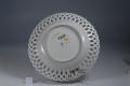 Додаток до назва (лист, ...): з ажурним бортом; розпис: у дзеркалі - букет дрібних квітів та три окремих квіточки./Авторські підписи, клейма: Марка./Комм.: Мануфактура в Південній Німеччині. Була тісно повязана з Вюртенбергським герцогським двором. Засноана в 1758 р. Не зважаючи на відсутність у країні каоліну та місцевого пального, мануфактура досягла у 18 ст. значних успіхів. Цьому сприяли великі грошові кошти, які надавав курфюрст Карл Євгеній, та вміле керівництво знаного арканіста Ріглера (Joseph Jakob Ringler), який залишився у Людвігсбурзі до кінця життя і пропрацював тут понад 40 років. Порцелянова маса Людвігсбургу не відрізнялась високими якостями, вона була сіруватою. Порцелянові вироби Людвігсбургу пройшли еволюцію від стилю рококо до класицизму. Першочергове місце в продукції мануфактури займала пластика. Випускались також сервізи, вази, ароматники, канделябри тощо. Найбільш популярними мотивами розпису були архітектурні пейзажі, батальні сцени, зображення тварин, птахів та квітів. У 1775 р., коли резиденція двору переїхала з Люксембургу до Штутгарта, цікавість до мануфактури поступово падає, виробництво скорочується. Після короткого підйому напочатку 19 ст. вона закривається у 1824 р./Історія Атрибуціi: Консультація Соловєйчік Р.С. (Ермітаж, 1961 р.) - Людвігсбург, бл. 1760-і рр. (здається є дата, а Людвігсбург дат не ставив, однак річь здається справжньою)/Кількість: 1