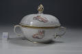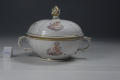 Додаток до назва (лист, ...): дольчаста, півкулястої форми, на кільцеподібній ніжці, з двома ручками; розпис: амури з гірляндами квітів та дрібні квіточки у розкидь. Кришка увінчана позолоченою шишечкою./Авторські підписи, клейма: Марка/Комм.: Виробництво порцеляни у Франкенталі (Пфальц) розпочалось у 1755 р. видатним керамістом та живописцем П.-А. Ханнонгом (Paul Antoine Hannong). Сімя гончарів Ханнонгів у Страсбурзі заснувала фабрику фаянса, вироби якої користувались в Європі великим визнанням. Павло Ханнонг знав таємницю виробництва порцеляни від утікача з Мейсену. Коли в 1754 р. було введено монополію на виробництво порцеляни в Севрі, Ханнонг переніс своє порцелянове підприємство до Франкенталя. У 1759 р. Ханнонг продав мануфактуру своєму синові Йосипу-Адаму (Joseph Adam Hannong), який працював тут скульптором. Однак, Йосип Ханнонг не зміг утримати підприємство у своїх руках і змушений був продати його (із-за фінансових труднощів) в 1762 р. пфальцьському курфюрсту Карлу Теодору. Директором мануфактури став А. Бергдаль (Adam Bergdoll). Незабаром мануфактура зайняла одне з перших місць серед південно-німецьких порцелянових підприємств. Порцелянова маса Франкенталя була біла, мала тільки легкий жовтуватий відтінок і своїм виглядом нагадувала французьську мяку порцеляну. Вироби Франкенталя за своїми художніми якостями вирізнялись серед інших порцелянових підприємств Південної Німеччини. Славу Франкентальській мануфактурі принесли вироби її скульптурної майстерні, яка займала друге місце після Мейсену за кількістю випущених моделей. Франкентальстка пластика, яка спочатку наслідувала зразкам Мейсенської мануфактури, відрізнялась різноманітністю зображень, які охоплювали всі улюблені теми 18 століття. Дуже популярним серед франкентальських виробів 60-их років 18 ст. були зображення селян за своїми заняттями, майстерно виконананих та наділених реалістичними рисами. У 50 - 69-і рр. 18 ст. вироби мануфактури прикрашались вигадливими завитками, характерними для стиля рококо. У розпису важливу роль відігравали бекети та окремі квіточки. Дрібними квіточками росписувались навіть костюми на фігурах. Часто використовувався однотонний розпис пурпуром або червоною фарбою: сцени у парку в стилі Ватто, мисливські та міфологічні сцени./Історія Атрибуціi: Консультація Соловєйчік Р.С. (Ермітаж, 1961 р.) - Франкенталь, 1770-ті рр. (чашка для бульйону з кришкою та піддоном)/Кількість: 1/Старі документи прийому: передано з сектору російського та українського мистецтва (зараз Музей російського мистецтва) до сектору західного та східного мистецтва Державного художнього музею (дело № 6. Ед. хр. № 44, опись № 1)/Зв'язок з іншими предм. музею: до піддону 44-ПК МХ