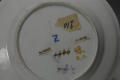 Додаток до назва (лист, ...): з хвилястим бортом; розпис: по краю борта та навколо дзеркала - позолочені смуги з блакитною штриховкою, в центрі букет квітів, по борту окремі квіточки./Авторські підписи, клейма: Марка синя підглазурна./Історія Атрибуціi: Консультація Соловєйчік Р.С. (Ермітаж, 1961 р.) - Цюріх, вторая пол. 18 ст./Кількість: 1/Старі документи прийому: передано з сектору російського та українського мистецтва (зараз Музей російського мистецтва) до сектору західного та східного мистецтва Державного художнього музею (дело № 6. Ед. хр. № 44, опись № 1)