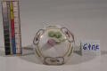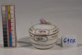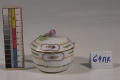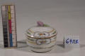 Додаток до назва (лист, ...): зображено тонку гірлянду зелениго листя, окремі гілочки та позолочена смуга, яка відтінена жовтим, біля верхнього краю - три фігурних медальйони з квіточками. Кришка увінчана рельефним розовим бутоном./Авторські підписи, клейма: Марка синя підглазурна./Історія Атрибуціi: Консультація Соловєйчік Р.С. (Ермітаж, 1961 р.) - Копенгаген, кін. 18 ст (цукорниця)/Кількість: 1/Старі документи прийому: за актомпередано з сектору російського та українського мистецтва (зараз Музей російського мистецтва) до сектору західного та східного мистецтва Державного художнього музею (дело № 6. Ед. хр. № 44, опись № 1)