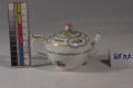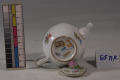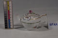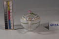 Додаток до назва (лист, ...): кулястої форми з зображенням тонкої гірлянди зелениго листя, окремих гілочок та позолоченої смуги, яка відтінена жовтим, біля верхнього краю - трьох фігурних медальйонів з квіточками. Кришка пласка, увінчана рельефним розовим бутоном./Історія Атрибуціi: Консультація Соловєйчік Р.С. (Ермітаж, 1961 р.) - Копенгаген, кін. 18 ст./Кількість: 1/Зв'язок з іншими предм. музею: Того ж сервізу, що й вазочка № 64 ПК МХ