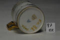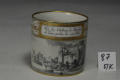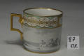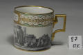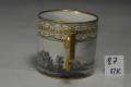 Закладка “Атрибуція” - Наим. предмета, издания: Чашка з видом Шато де Бранде та гавані/Змiн.додаток до назва (лист, ...): циліндрична з прямокутною позолоченою ручкою із зображенням пейзажу з замком; вздовж верхнього краю борта широка орнаментована смуга./Змiн. Написи, клейма, марки: Марка синя підглазурна: щит. В тісті вдавлено цифри: 95/Змiн.опис: Напис:"Vue du Chateau de Brindes et dune partie de son Port" (Вид Шато де Бранде (Бріндізі)та частини його порту)/Змiн. час створення: 1795 р.місце створення, школа: Імператорська державна порцелянова мануфактура.Новый материал: порцелянаИзм. техника: розпис гризайлевийИзм. техника: тонуванняИзм. техника: золочення