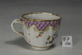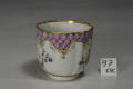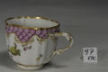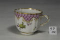 Додаток до назва (лист, ...): видовжена, чотирьохлопатева, на кільцеподібній ніжці; розпис: зображення квітів та фруктів, по краю борта - чешуйчатий лиловий бордюр./Авторські підписи, клейма: Марка синя підглазурна./Історія Атрибуціi: Консультація Соловєйчік Р.С. (Ермітаж, 1961 р.) - Відень, 1760 р./Кількість: 1/Зв'язок з іншими предм. музею: чашечка до блюдця 98-ПК МХ