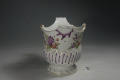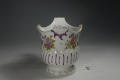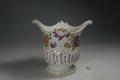 Додаток до назва (лист, ...): з фігурним краєм та двома пласкими ручками; декор: у нижній частині - рельєфна смуга з фіолетовими штрихами, у верхній - букети квітів./Авторські підписи, клейма: Марка синя підглазурна./Історія Атрибуціi: Консультація Соловєйчік Р.С. (Ермітаж, 1961 р.) - Відень, бл. 1760 р. (пляшкова передача)/Кількість: 1/Зв'язок з іншими предм. музею: аналогічне до № 100-ПК МХ