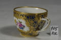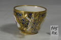 Додаток до назва (лист, ...): скруглена до низу, з ручкою у вигляді перевитих гілочок; декор: на синьому підглазурному тлі з ажурним золотим орнаментом, у резервних фігурних медалйонах - букетики квітів./Авторські підписи, клейма: Марка синя підглазурна./Історія Атрибуціi: Консультація Соловєйчік Р.С. (Ермітаж, 1961 р.) - Відень, 1780-і р./Кількість: 1/Зв'язок з іншими предм. музею: чашечка до блюдця 106-ПК МХ