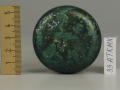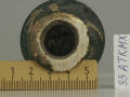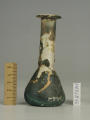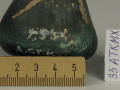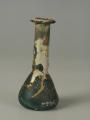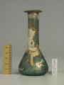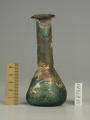 Бальзамарій товстого зеленого скла з грушоподібним корпусом і довгою циліндричною шийкою з пласкими відігнутими вінцями.