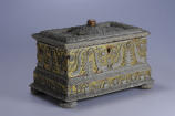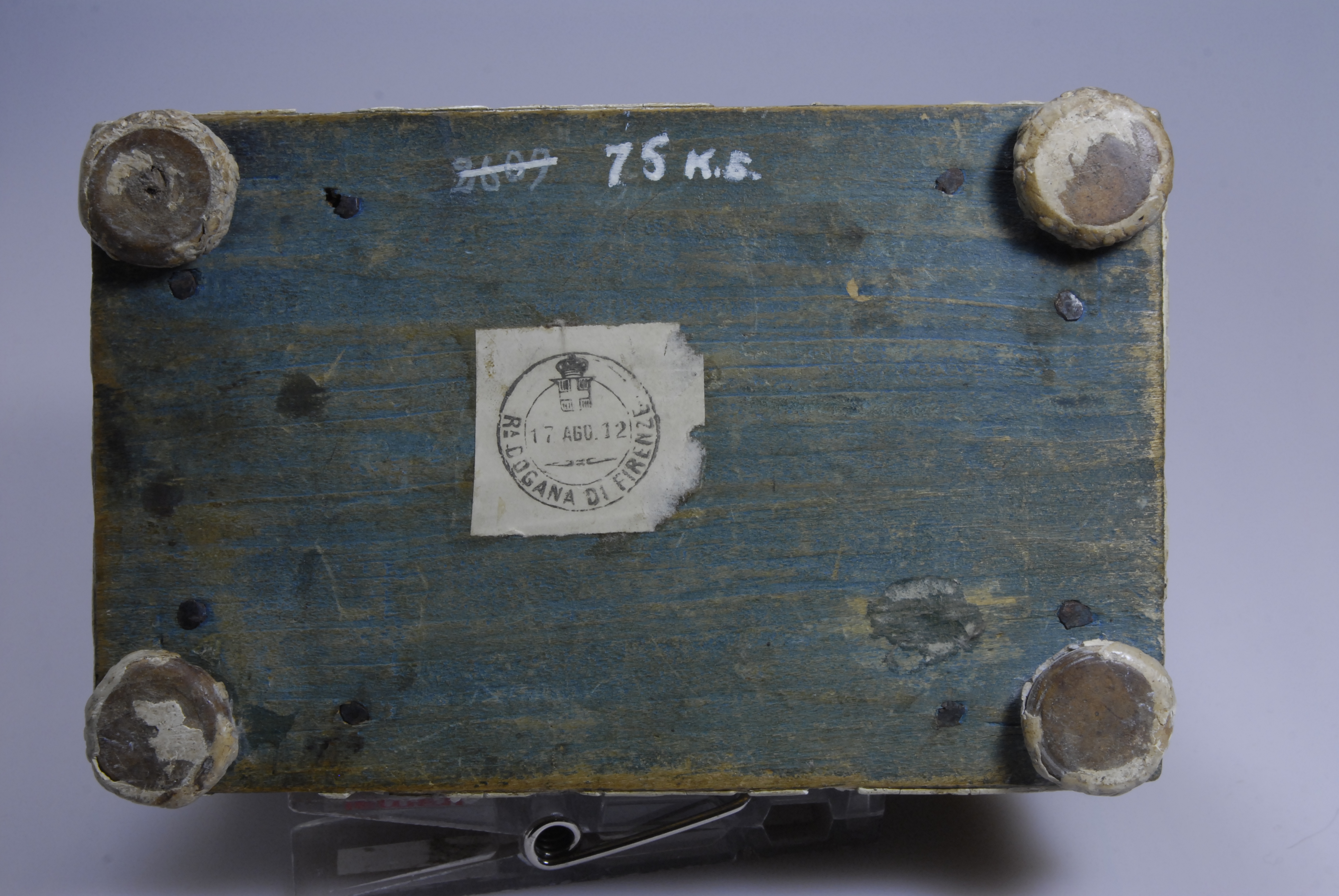 /Змiн. Iншi написи, штампи, печатки, етикетки, наклейки: паперова наклейка зі штампом флорентійської митниці: «R.Dogana di Firenze 17 Ago (sto) 12.», що розташована на дні скриньки./Змiн. час створення: перша половина ХVI ст.місце створення, школа: Північна ІталіяНовый материал: вільха сіраИзм. техника: золоченняИзм. техника: рельєф "пастілья"
