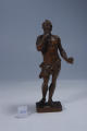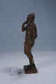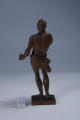 Кількість: 1/Опис: Зображений чоловік, що стоїть. Вбраний у драперію, яка прикриває стегна. На усміхненому обличчі – вуса та гостра борідка. На голові – ковпак із заокругленим верхом. Права рука пальцями торкається підборіддя, ліва опущена, долоня із відбитими пальцями охоплює невідомий предмет, від якого збереглася лише частина у долоні.