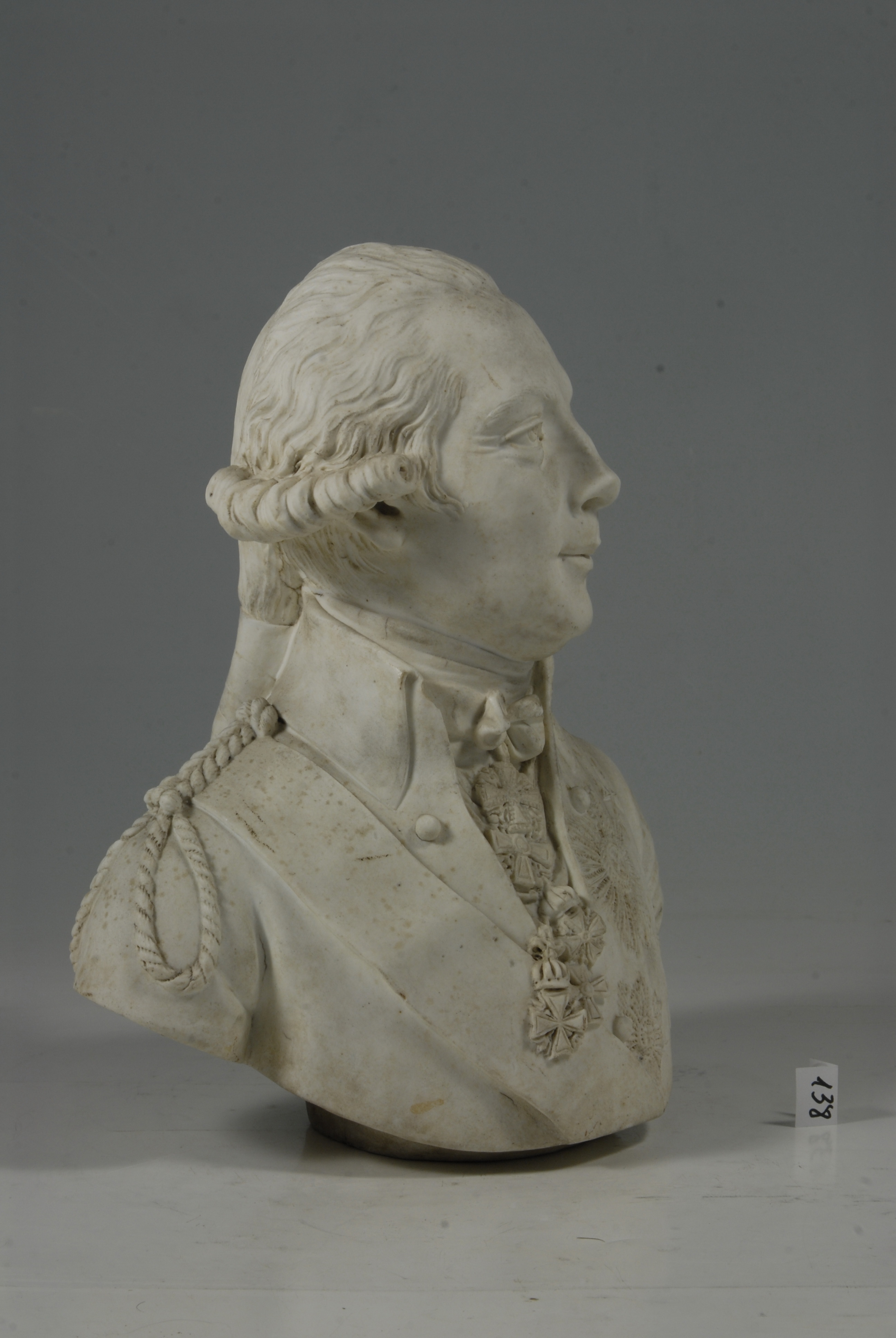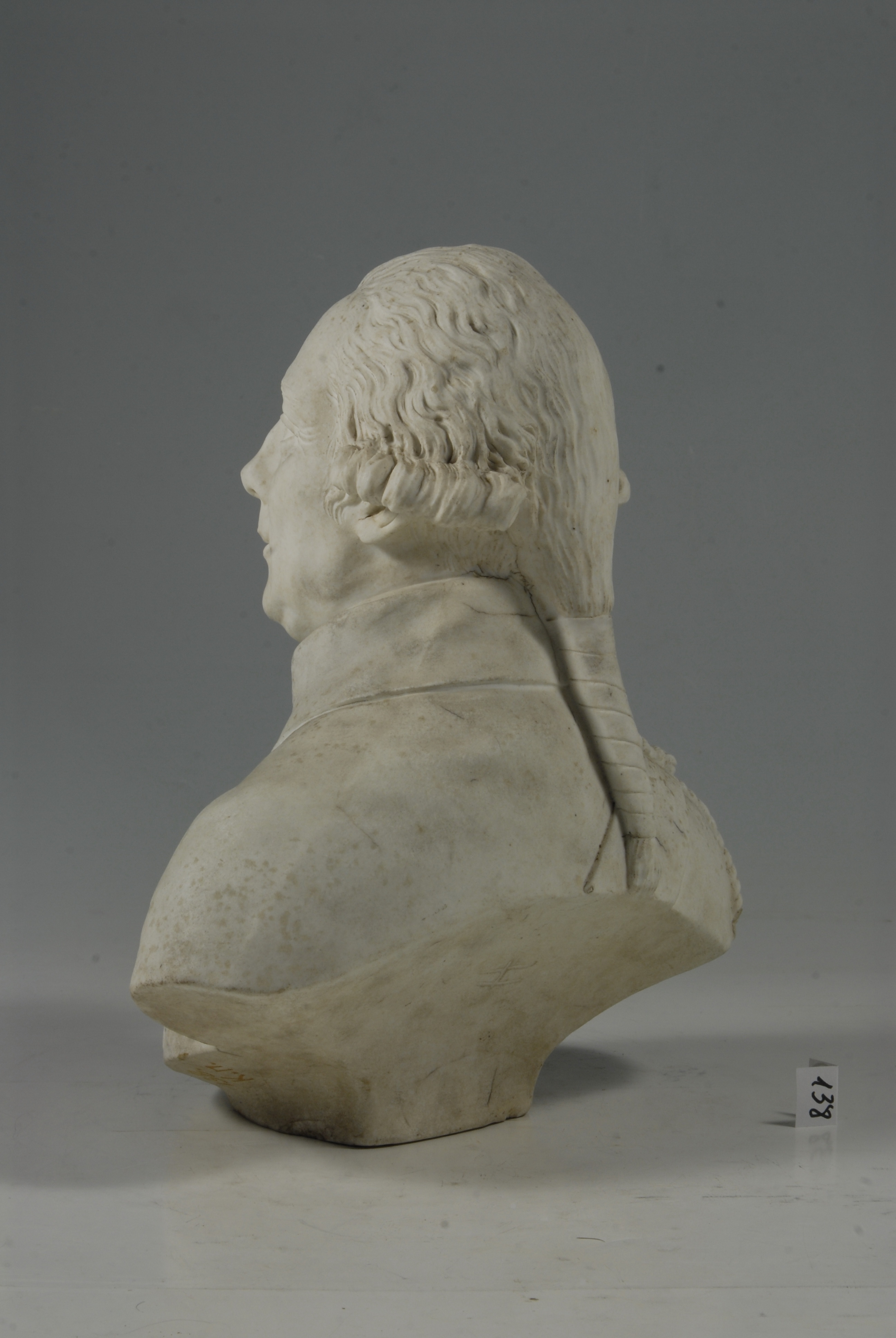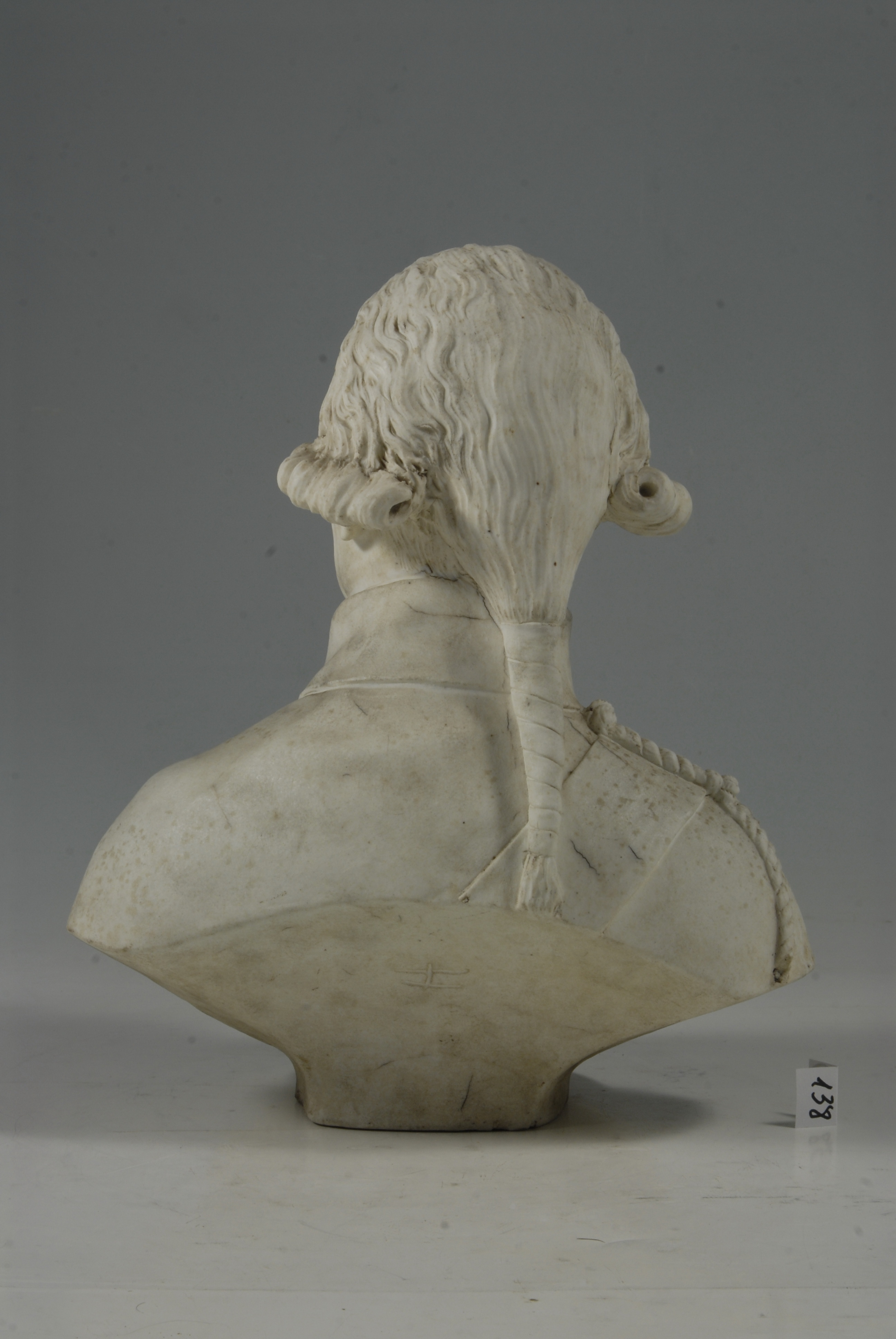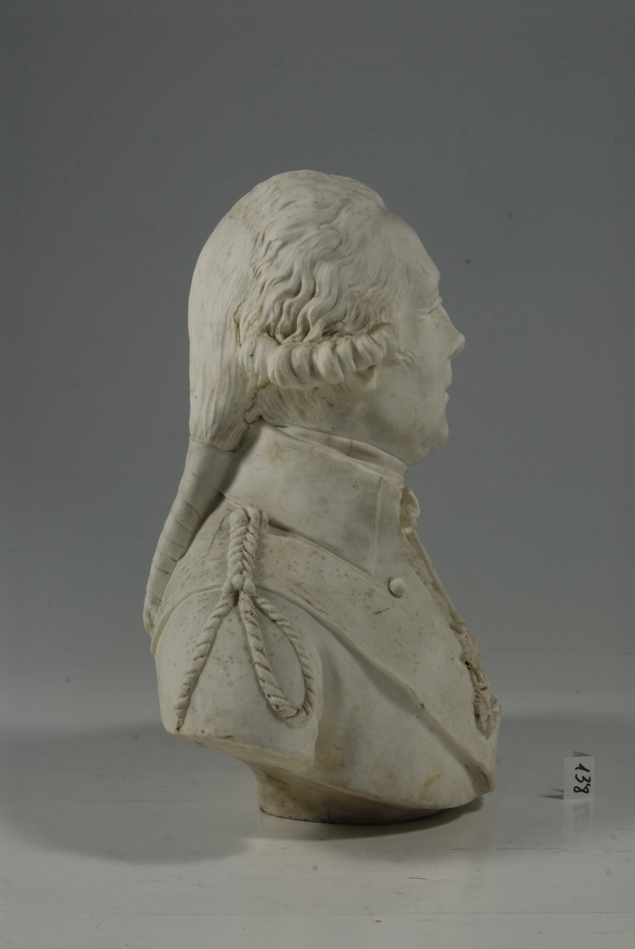 Додаток до назва (лист, ...): у перуці з буклями та косою./Авторські підписи, клейма: Марка в тісті/Історія Атрибуціi: Консультація Соловєйчік Р.С. (Ермітаж, 1961 р.) - кін. 18 ст. (бюст військового, бісквіт)/Кількість: 1