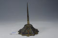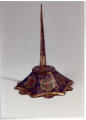 Закладка “Атрибуція” - Змiн.опис: Свічник у вигляді усеченной шестигранної піраміди. Грані свічника декоровані медальйонами з гербами в середині, які виконані в техніці виїмчастих емалей та підкреслені гравірованим орнаментом по золоченому тлу. Верхня та нижня частини пірамідки декоровані золотавими смугами гравірованого стилізованого рослинного орнаменту. Від нижнього краю кожною грані відходять позолочені виступи-ніжки, декоровані гравірованим орнаментом.