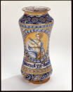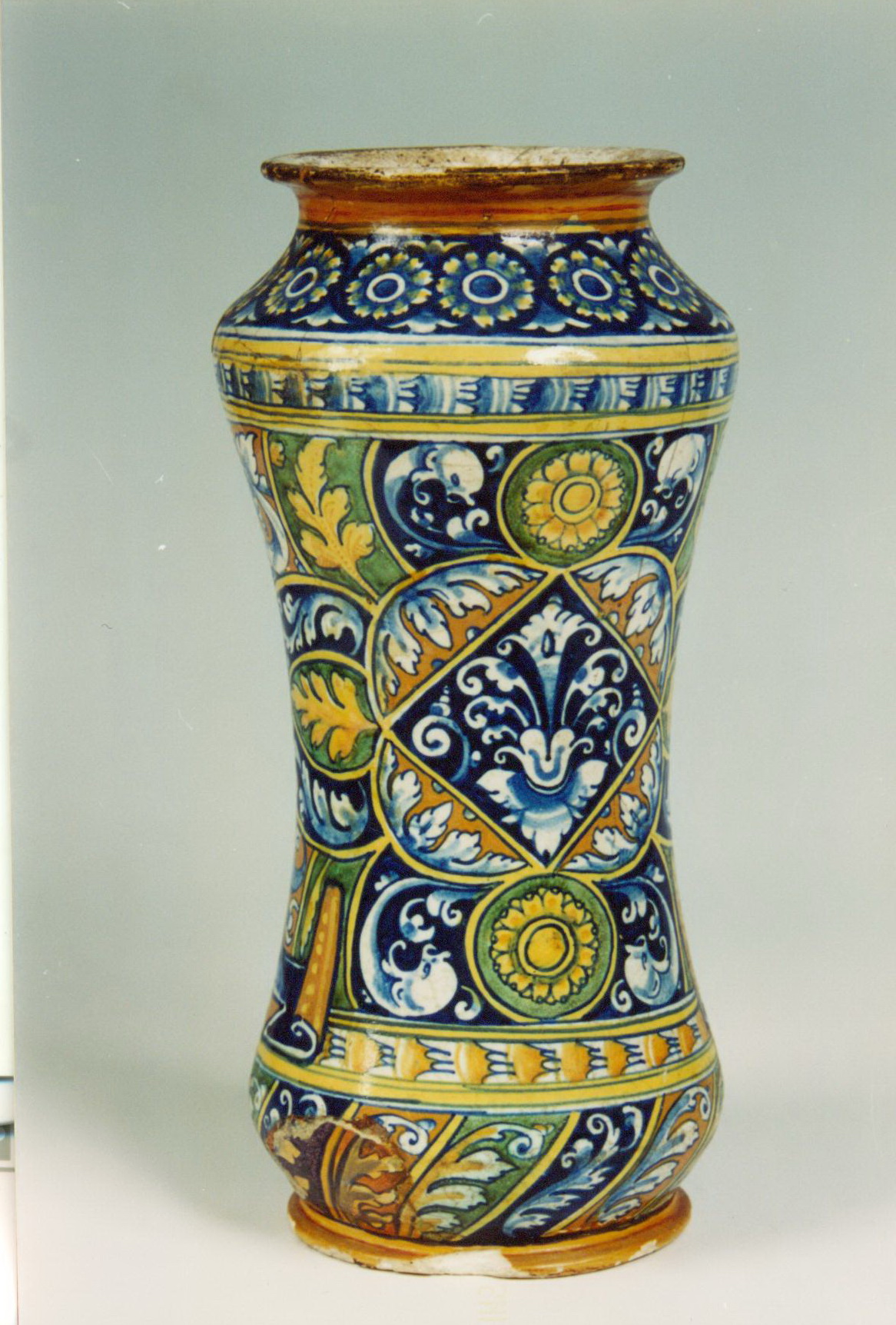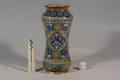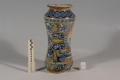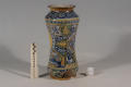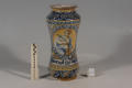 Закладка “Атрибуція” - Змiн.додаток до назва (лист, ...): Альбарелло із поколінним зображенням в овальному медальйоні св. Катерини/Змiн.опис: Альбарелло злегка звуженої у центральній частині форми, із зображенням св. Катерини Александрійської в овальному медальйоні. у нижній частині форми на білій стрічці напис готичними літерами: Zucari. d. ros dagnis (рожевий цукор). Над ніжкою смуги орнаменту із стилізованих гілок аканту. Фарби сині, жовті, зелені./Змiн. час створення: перша чверть XVI ст. (каталог Рославець О.М. 2003 р.)Новый материал: майоліка