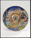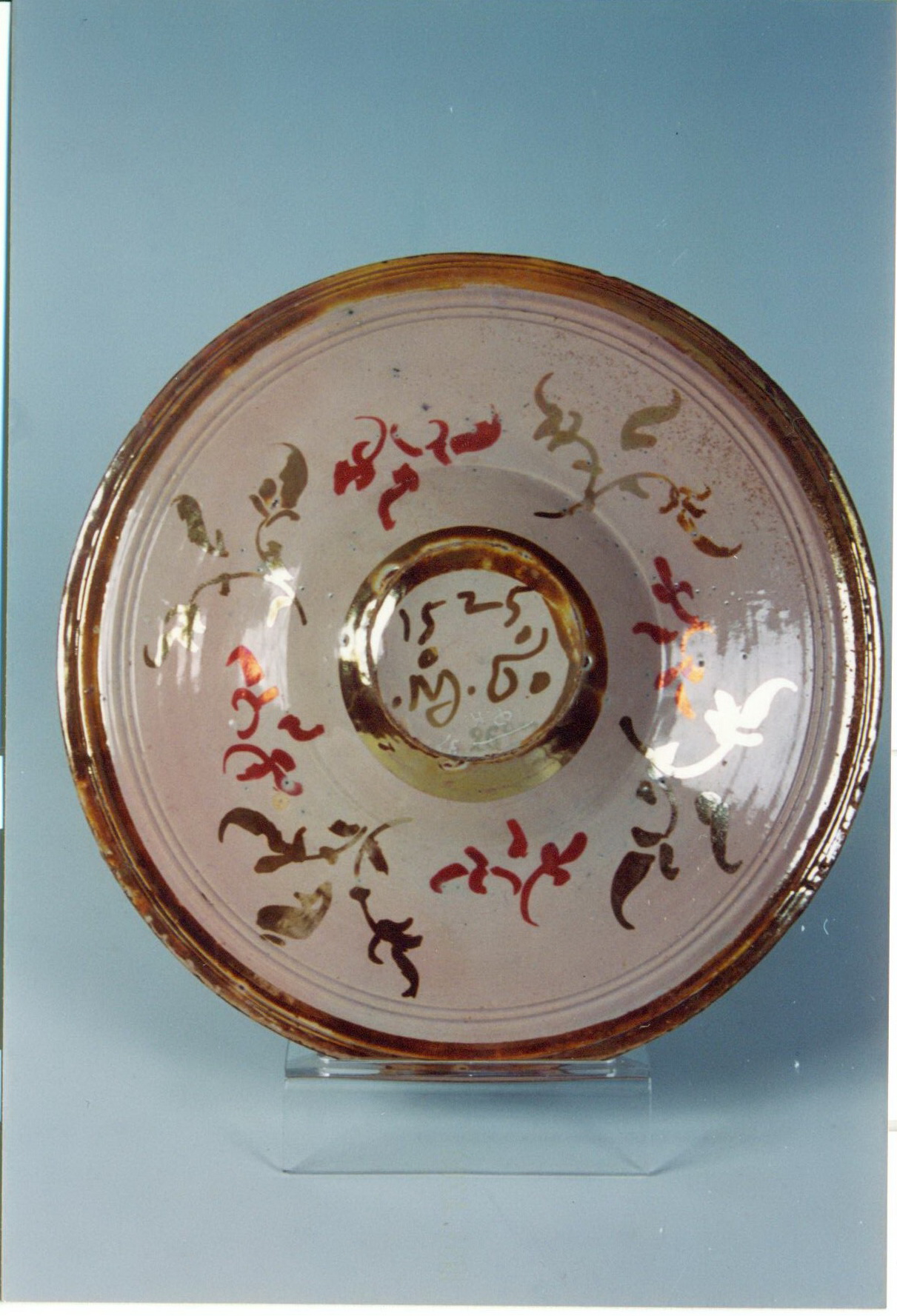 Информацiя об оригiнале: фігура дитини та старого запозичені з гравюри Марантоніо Раймнді "Старий пастух" (В № 434)/Авторські підписи, клейма: На звороті нанесені рубіновим та золотистим люстром гілочки. На денці дата 1525 та монограма Андреолі: MG (майстер Джорджо)./Кількість: 1