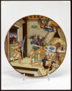 Закладка “Атрибуція” - Змiн.опис: Тарілка із зображенням сцени вбивства. Праворуч, біля накритого перед ліжком столу, на підлозі зображено тіло вбитого старого чоловіка. Поруч стоїть воїн з скривавленим мечем в руках. Над ним зображено Перемогу, яка увінчує його лавровим вінком. Ліворуч, у дверях, втікаючиц Амур.