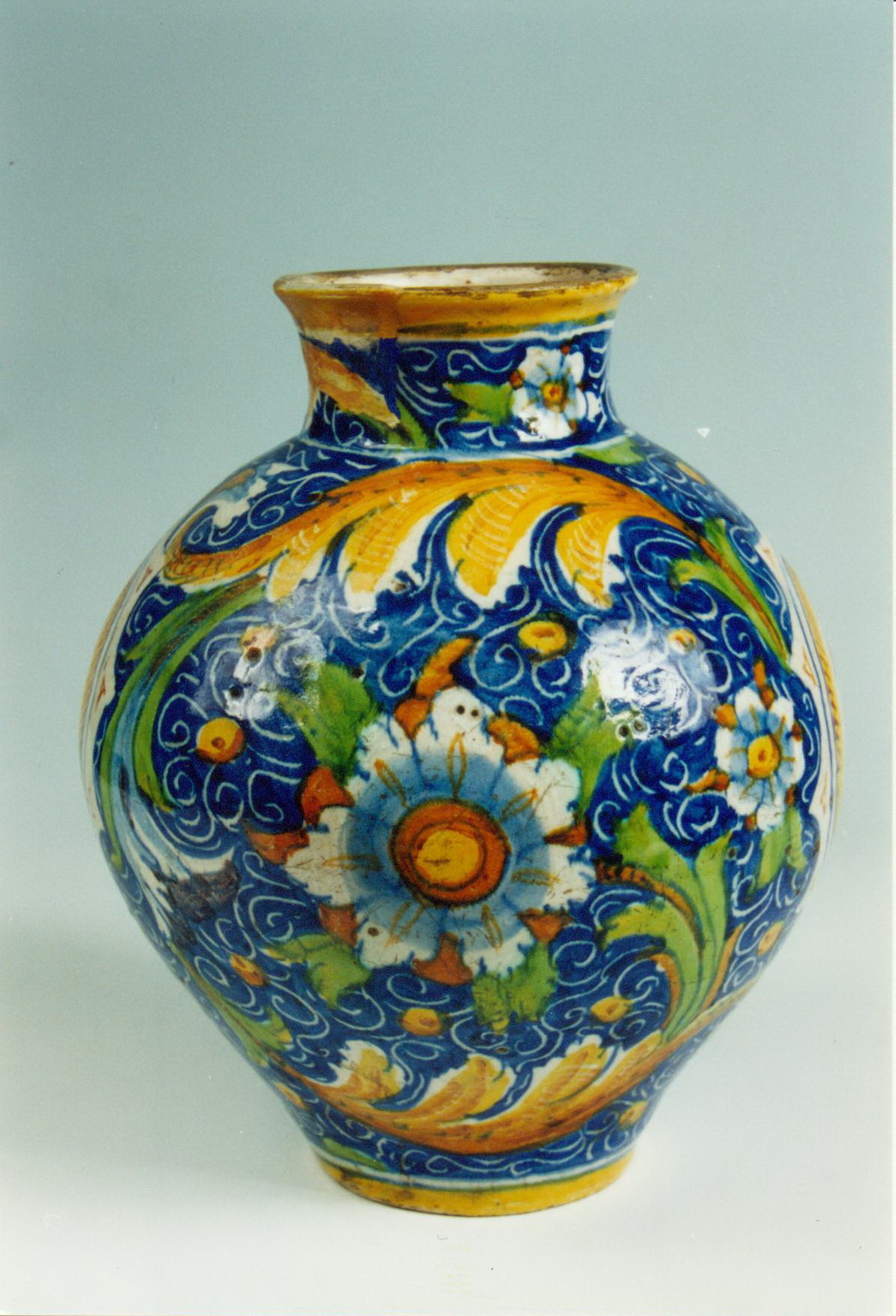 Закладка “Атрибуція” - Наим. предмета, издания: Ваза аптечна/Змiн. Написи, клейма, марки: Біла квітка (ромашка або маргаритка) з жовтою серединкою вважється знаком майстрені Доменіко да Венеція./Змiн.опис: Ваза з округлим тулубом, яке звужується у нижній частині, та широким невисоким горлом. Тулуб вази декорований рослинним орнаментом із листя аканта та шестипелюсткових квітів по синьому тлу. Обабіч, у медальйонах, погрудне зображення жінки з сережкою із перлиною та у сукні з високим, білим коміром, у другому - поколінна фігура святого Бенедикта (?) з книгою та хрестом у руках.