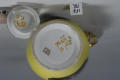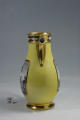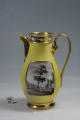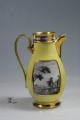 Додаток до назва (лист, ...): високий, грушоподібної форми, на кільцеподібній ніжці, з пласкою ручкою; на жовтому тлі - два резервних прямокутних медальйони із зрізаними кутами з зображенням пейзажів "en grisaille"; медальйони обрамлені золотою смугою; ручка, носик та ніжка золочені./Історія Атрибуціi: Консультація Соловєйчік Р.С. (Ермітаж, 1961 р.) - Франція, поч. 19 ст. Париж ?, можливо провінціальна мануфактура (чайник для окропу)/Кількість: 1