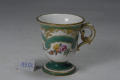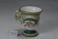 Додаток до назва (лист, ...): з ручкою у вигляді завитка рокайль, на широкій ніжці; розпис: зелений бордюр з золотим рослинним орнаментом, зелена смуга, яка створює чотири петлі, та гірлянди квітів./Авторські підписи, клейма: марка синя підглазурна/Історія Атрибуціi: Консультація Соловєйчік Р.С. (Ермітаж, 1961 р.) - Севр, 1758 (чарочка для вермуту)/Кількість: 1
