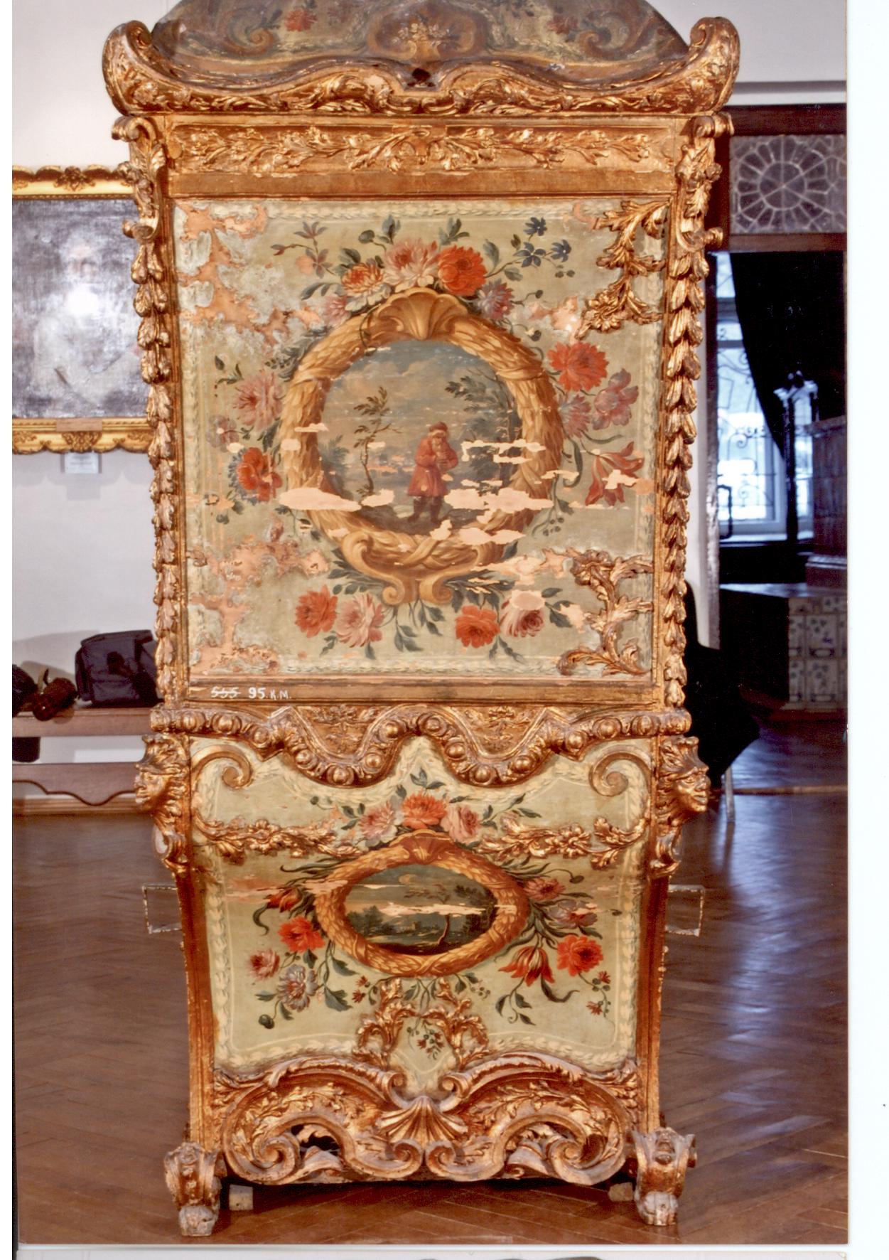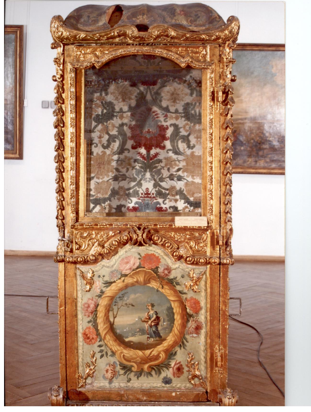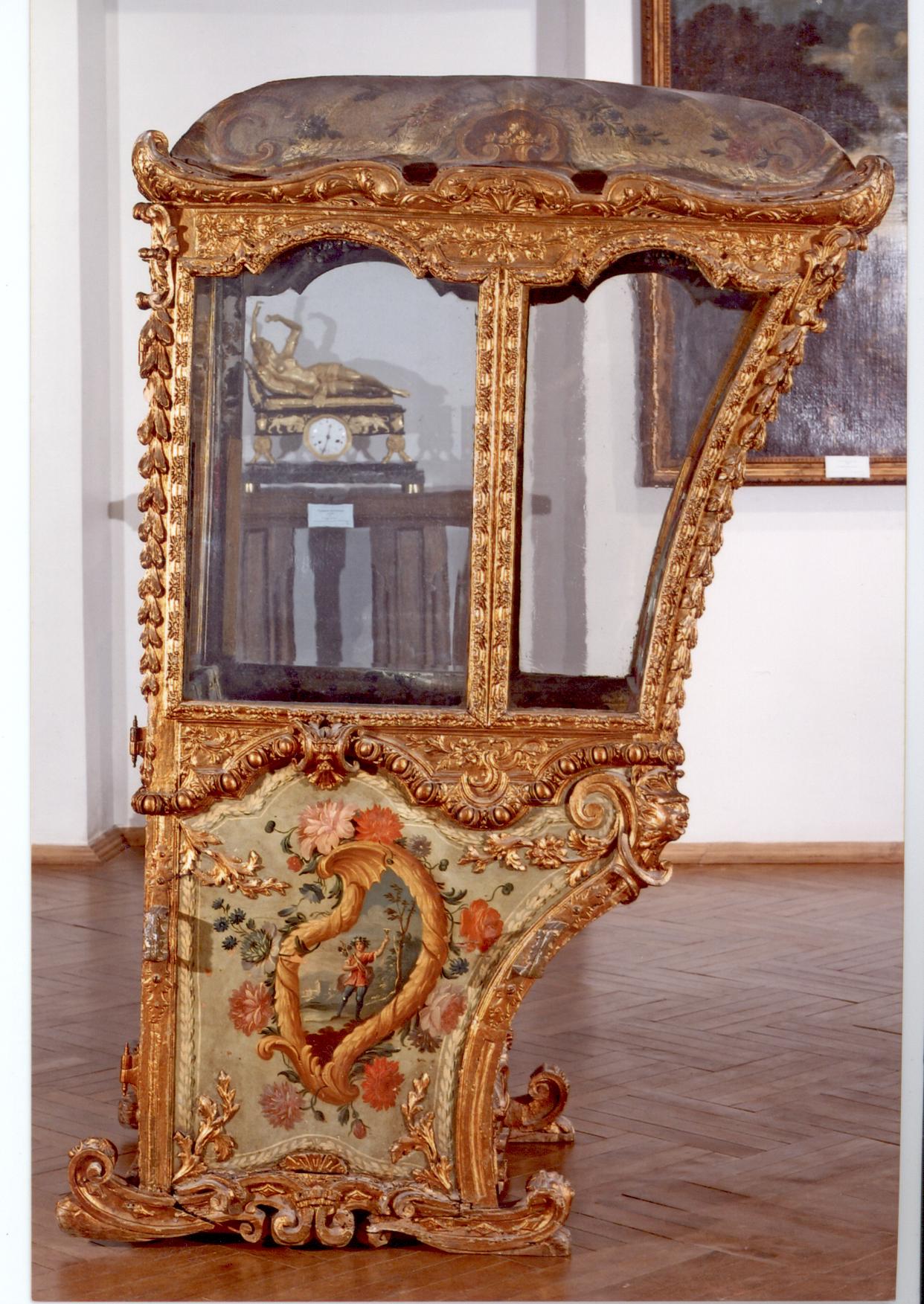 Додаток до назва (лист, ...): Портшез у вигляді пагоди з вигнутою спинкою; обрамлення двері, спинки, вікон, балдахіну прикрашені різьбленням та позолочені. На стінках, унизу під вікнами – живопис: на світло-зеленому тлі фігурні медальйони із зображенням жінок./Кількість: 1