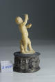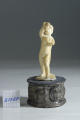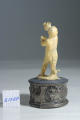 Задовільна. Пилові забруднення, пожовтіння, незначні тріщини. На правій нозі склейка по місцю зламу. На лівій нозі місце зламу на стопі, залишки клею. На зворотній стороні темні плями синьо-чорного кольору. Неміцне закріплення на основі. Залишки клею на підставці.