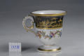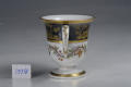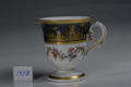 Додаток до назва (лист, ...): Чашечка циліндричної форми з фігурною рельєфною ручкою. Розпис двокольоровим золотом та платиною; поліхромні гірлянди./Авторські підписи, клейма: Зі зворотного боку на дні (червоним):марка у вигляді двох переплетених літер L під короною, датування літерами «nn», знак у вигляді трикутника з хвилястими рисками – знак Жан-Жака Дьйо (Dieu, Jean-Jacques)/Історія Атрибуціi: Консультація Соловєйчік Р.С. (Ермітаж, 1961 р.) - Франція, Севр, 1791 р. (чарочка для крюшону, розпис наслідує китайський чорнолаковий; кобальт)/Кількість: 1/Старі документи прийому: за списком № 202/Опис: Чашечка циліндричної форми, що розширюється догори раструбом та заокруглюється донизу, з вузькою ніжкою на круглому базисі та фігурною рельєфною ручкою. На тулубі: зверху чорна смуга, розписана двокольоровим золотом та платиною – фігури китайців в архітектурному пейзажі, нижче, на білому тлі, – обведені золотом поліхромні гірлянди з листя, квітів та плодів. По краю борта, на ніжці та ручці – позолота./Зв'язок з іншими предм. музею: 198 ПК