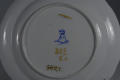 Додаток до назва (лист, ...): з хвилястим краєм; розпис: по борту - орнамент з гірлянд дрібних квітів, обрамлений орнаментованими синіми смугами, в дзеркалі, в круглому медальйоні, зображення птаха на гілці./Авторські підписи, клейма: Марка синя підглазурна.
