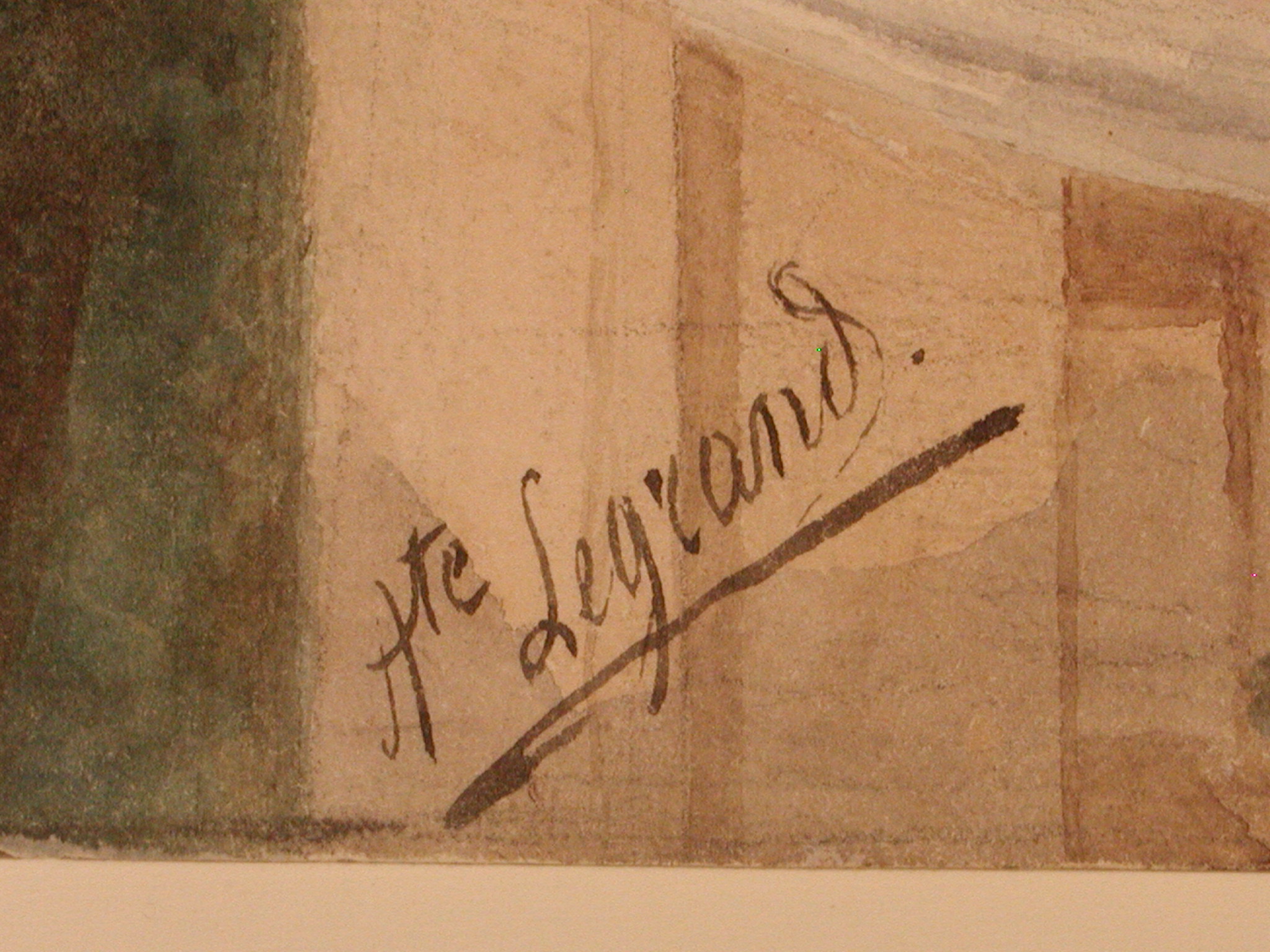 Закладка “Атрибуція” - Змiн. авторські пiдписи i написи: На балюстраді ліворуч підпис./Змiн.опис: В центрі на першому плані - жінка, яка сидить на балюстраді, звернена в 3/4 вправо, правою рукою тримаючи над собою розкриту маленьку білу парасольку від сонця, ліву поклавши на коліна. На ній пишна світла сукня, прикрашена мереживом і стрічками. На правій руці - каблучка і масивний браслет. Темне хвилясте волосся зачісане назад і прикрашене ззаду мереживною стрічкою. На другому плані - пейзаж.Автор, автор съемки: Легран Огюстен Клод Сімон