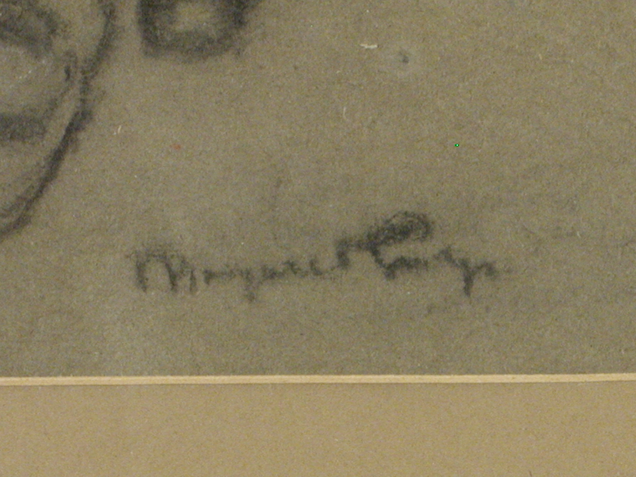 Закладка “Атрибуція” - Змiн.опис: В центрі маленька рожевощока дівчинка, яка сидить на дитячому стільці, обома руками тримаючи на підставці перед собою аркуш паперу, схиливши до нього голову. Вона в короткій сукні з довгими рукавами і відкладним комірцем, туфлях і шкарпетках. Коротке волосся і чілка зачісані на лівій бік./Змiн. Iншi написи, штампи, печатки, етикетки, наклейки: У правому нижньому куті підпис.
