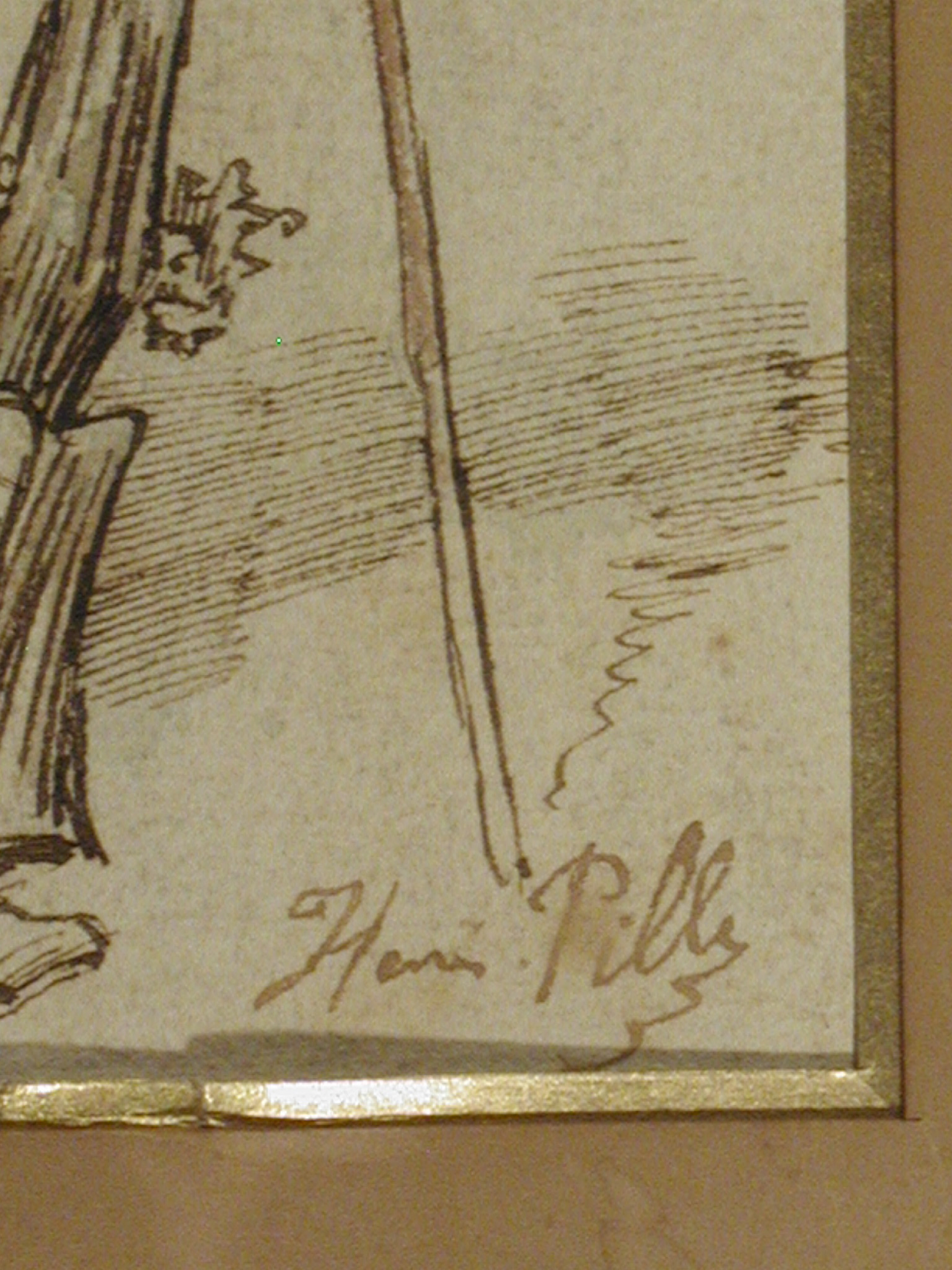 Закладка “Атрибуція” - Змiн. авторські пiдписи i написи: У правому нижньому куті підпис - Henri Pille./Змiн.опис: В центрі звернений в 3/4 вліво чоловік, який стоїть, широко розставивши ноги, лівою рукою спираючись на мушкет, який тримає за дуло. В його правій руці - келих з вином, на голові - капелюх з пером, на лівому боці - шпага.Автор, автор съемки: Пілль Шарль Анрі
