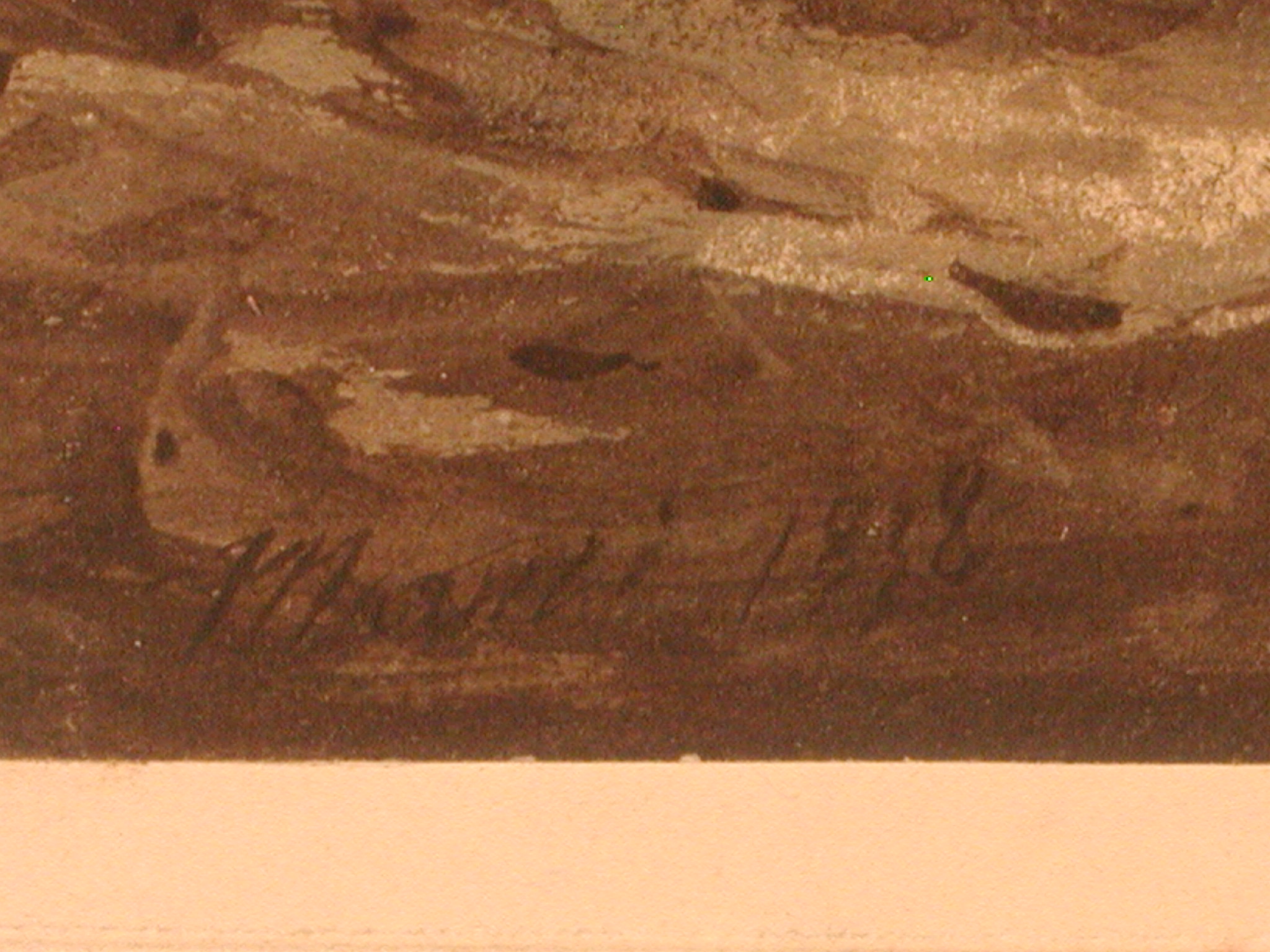 Закладка “Атрибуція” - Змiн.опис: Розбурхане море. В центрі та ліворуч - скелі. Праворуч від центра на другому плані корабель, що тоне. Ліворуч на першому плані 6 людських фігурок на скелях, влибині на скелі ще 3 фігури./Змiн. Iншi написи, штампи, печатки, етикетки, наклейки: На звороті у лівому верхньому куті напис синім олівцем "27 з.ш.", у верхній частині по центру - білою крейдою "III", нижче - "122". У правому нижньому куті фарбою "7320", "1455".
