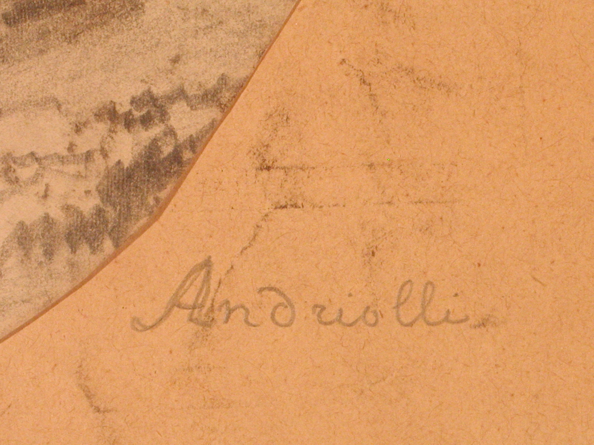 Закладка “Атрибуція” - Змiн. авторські пiдписи i написи: Малюнок наклеєний на папір, на папері праворуч унизу напис: "Andriolli"/Змiн.опис: В центрі - молода дівчина-циганка, яка танцює. Її права нога висунута вперед, тіло трохи відхилене назад і ліворуч. У піднятій над головою правій руці - бубун, ліва рука зігнута в лікті. На дівчині біла сорочка, довга спідниця та високо підперезаний темний фартух, що розвивається; на голові - біла хустка. З боків від неї - вільно намічені кущі.