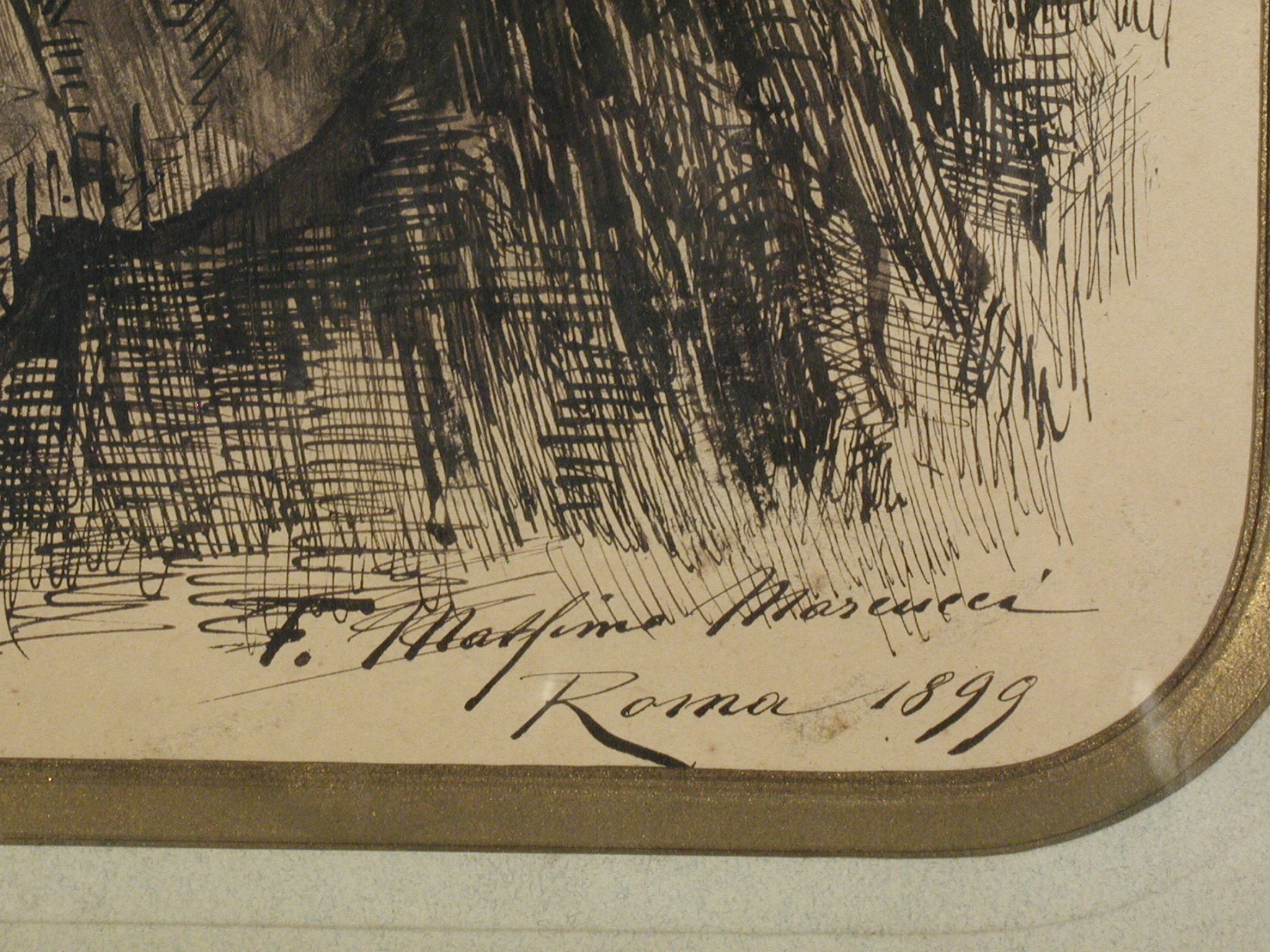 Закладка “Атрибуція” - Змiн. авторські пiдписи i написи: Біля нижнього краю праворуч підпис і дата: "F. Martimo Marcucci. Roma 1899"/Змiн.опис: Жінка з повним обличчям з подвійним підборіддям, яка сидить за невеличким столиком, поклавши руки зі сціпленими пальцями на закриту книгу, що лежить на столику. На ній темна широка сукня з маленьким білим комірцем, поверх якої накинута велика темна шаль. Темне гладенько зачісане і зібране ззаду у невеликий пучок.