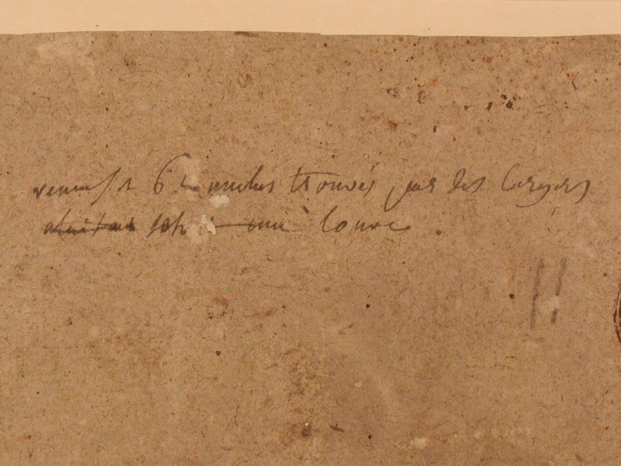 Закладка “Атрибуція” - Змiн. авторські пiдписи i написи: На звороті угорі в центрі - нерозбірливий напис чорнилом, праворуч - чорною фарбою "2012", нижче олівцем "3/9"; у правому нижньому куті блакитною фарбою "603"./Змiн.опис: На першому плані - піщана коса серед річки. В центрі - діти Ромул і Рем, що сидять на землі поряд з вовчицею. Праворуч густі зарості і фігури чоловіка та жінки в античному одязі, що біжать вліво. На другому плані на березі - три людські фігури. Праворуч - скеля з деревами на вершині. Ліворуч - кущі і дерева. На дальньому плані - група будівель на березі річки.