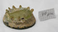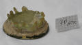 Два фрагменти з товстого скла, скріплені зкам’янілим алебастром: Верхня частина – диск з прозорого товстого зеленуватого скла з заглибленням у центрі, нижня – з темно-зеленого прозорого скла, нагадує відбите дно посудини, до якого зі зворотнього боку при