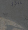Аркуш обрізаний по фацету, дубльований на синій щільний папір. Праворуч унизу та по правому краю невеликі розриви. На звороті ліворуч відшарування паперу, сліди клею та наклеєного паперу по краях.,