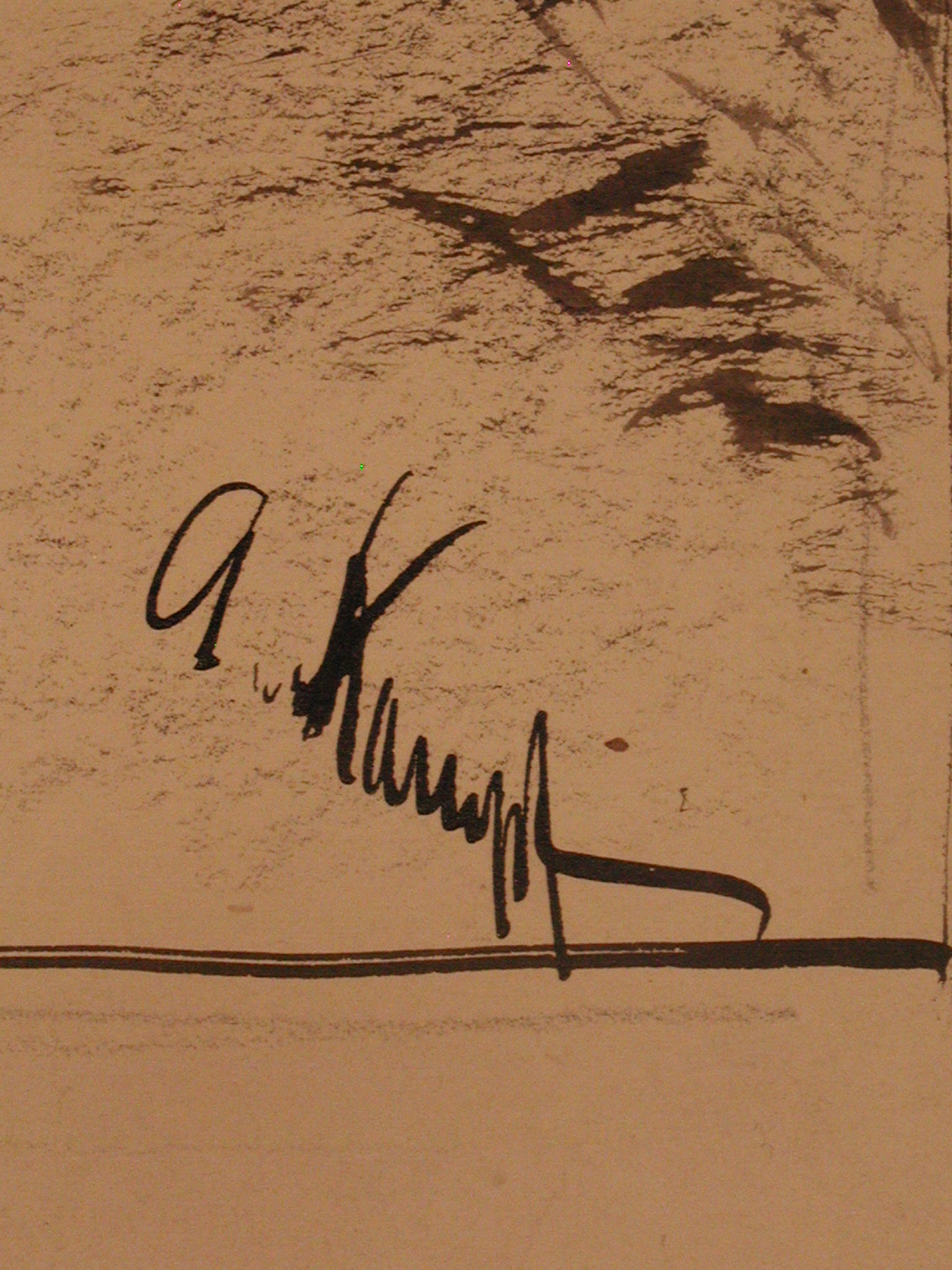 Закладка “Атрибуція” - Змiн. авторські пiдписи i написи: У правому нижньому куті підпис: A.Kampf./Змiн.опис: В центрі - жінка із загорнутою в чорну хустку дитиною на руках. Ліворуч від неї чоловік в капелюсі, що стоїть спиною до глядача, схиляючись до дитини і правою рукою тримаючи її за хустку. Лівіше - чоловік в картузі з вузлом в правій руці. Праворуч - вхід до будинку з 2-ма сходинками.