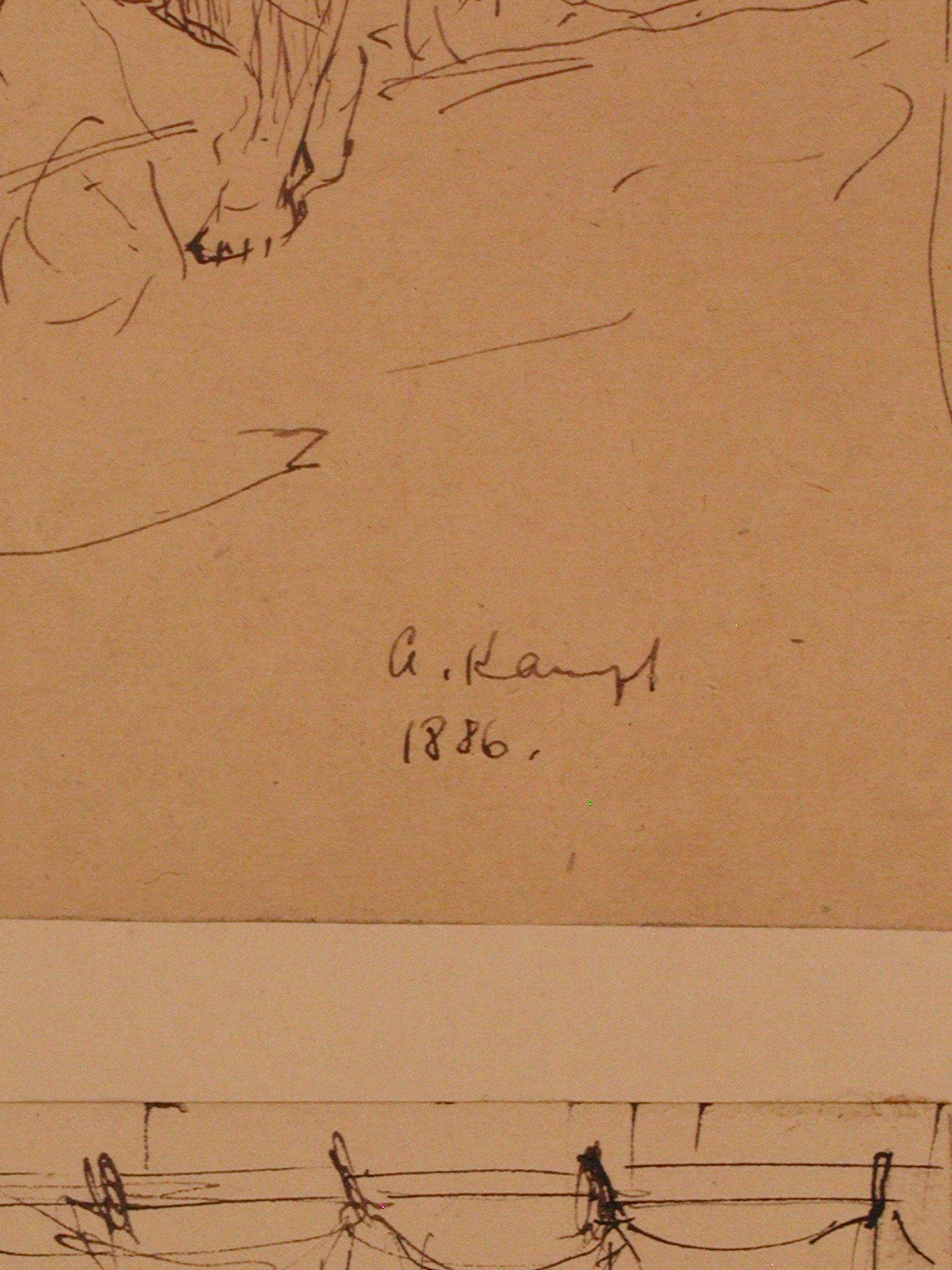 Закладка “Атрибуція” - Змiн. авторські пiдписи i написи: Праворуч унизу підпис: A. Kampf.1886/Змiн.опис: В центрі - товстий п'яний Силен у вінку. Позаду нього - Фавн, який підтримує його за ліву руку. На другому плані з-за пагорбу видно напівфігуру Сатира.