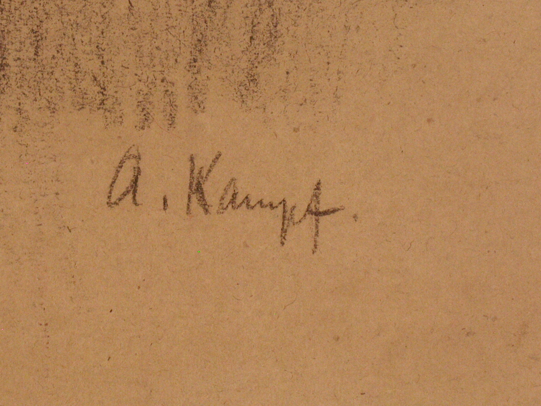 Закладка “Атрибуція” - Змiн. авторські пiдписи i написи: Унизу правіше від центру підпис: A. Kampf./Змiн.опис: Ліворуч - звернений в профіль вправо коваль з вусами, в картузі, довгому фартусі, жилеті та сорочці із закатаними вище ліктя рукавами, який схилився до ковадла, розташованого праворуч.