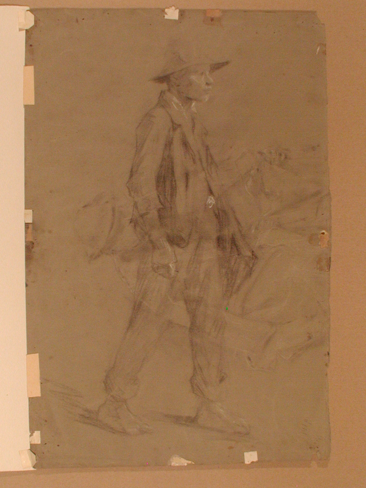Задовільний. Численні дрібні плями та проколи. Правий нижній кут відірваний. В двох місцях надриви. На звороті ледве накреслена фігура чоловіка, горі рисунок зображує юнака, який йде. Сліди наклейок,