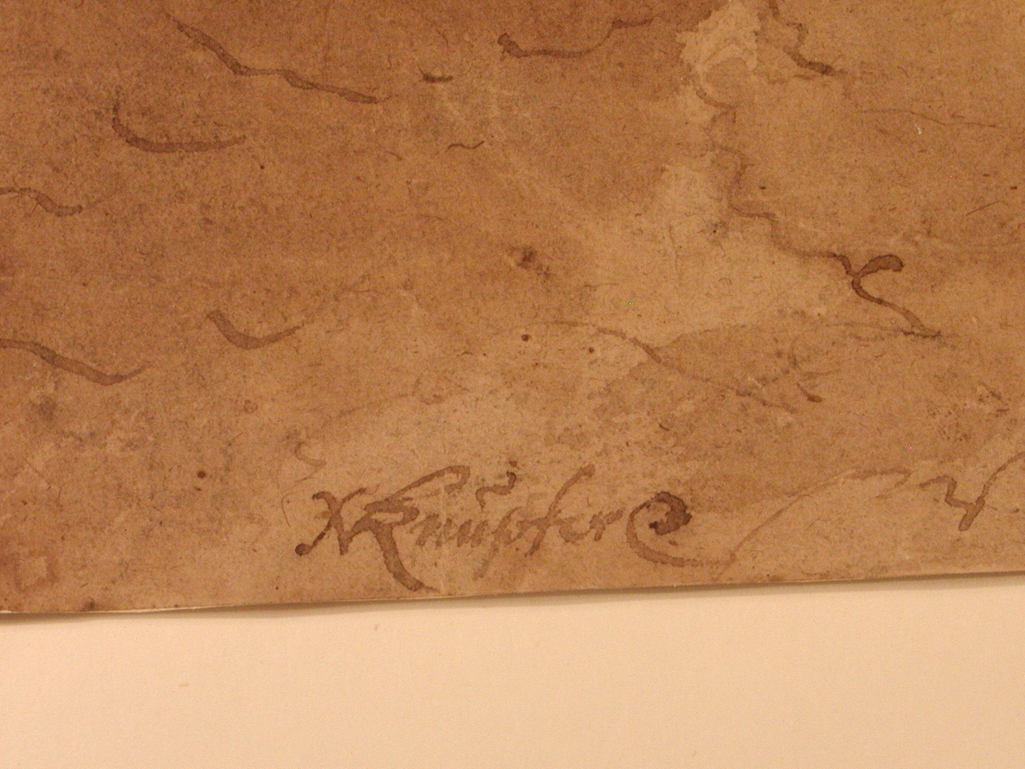 Закладка “Атрибуція” - Змiн. авторські пiдписи i написи: Праворуч унизу підпис: "Кnupfer"./Змiн.опис: Праворуч - оголений кучерявий бородатий чоловік у вінку з дубового листя,, який сидить в хмарах, уперши в бік ліву руку, з-під якої визирає посох. Позаду - дівчина, яка схиляється до нього. За її лівим плечем - голова ще однієї дівчини. Ліворуч від чоловіка у хмарах - третя дівчина, яка поклала голову на складені руки.