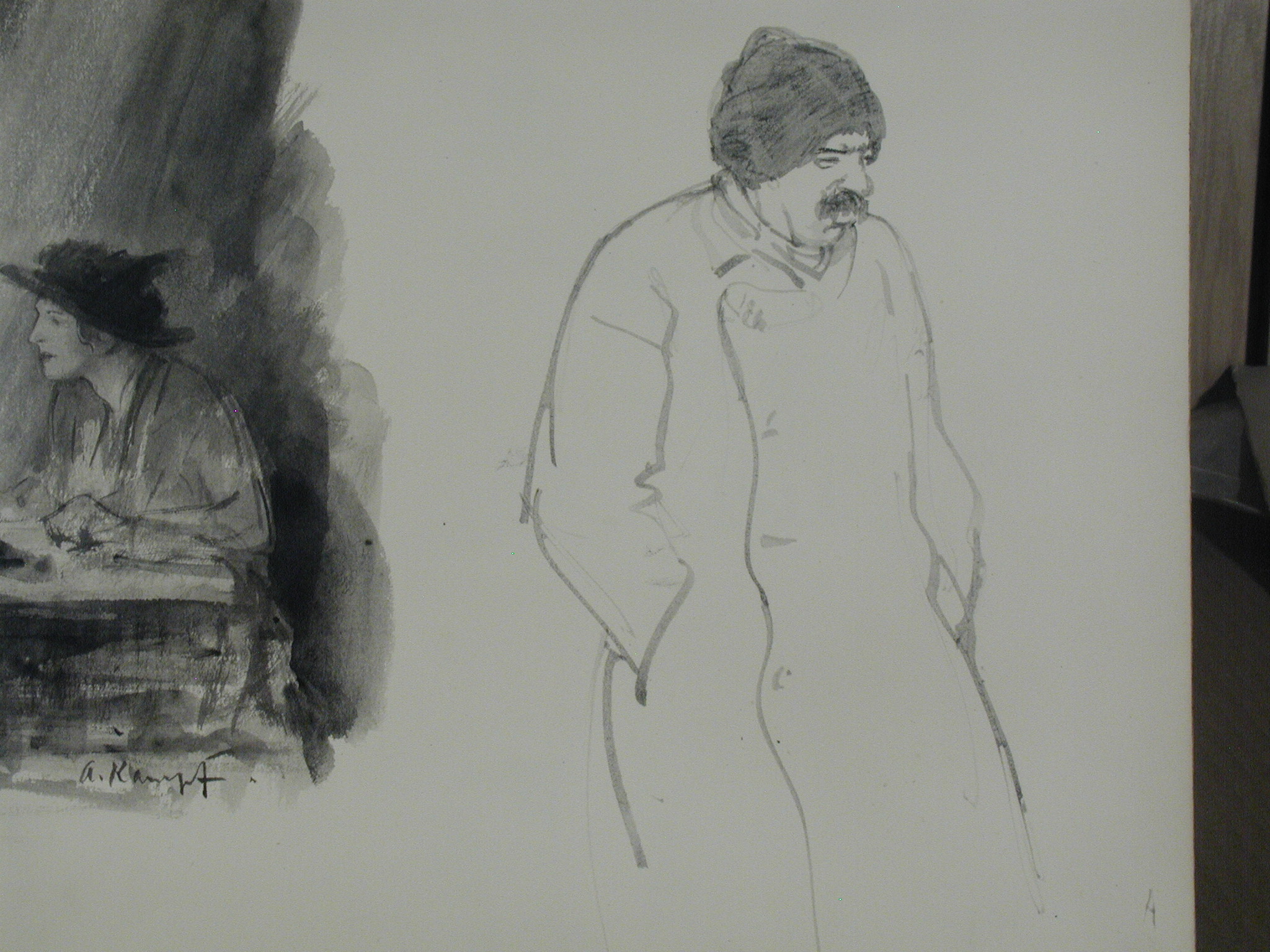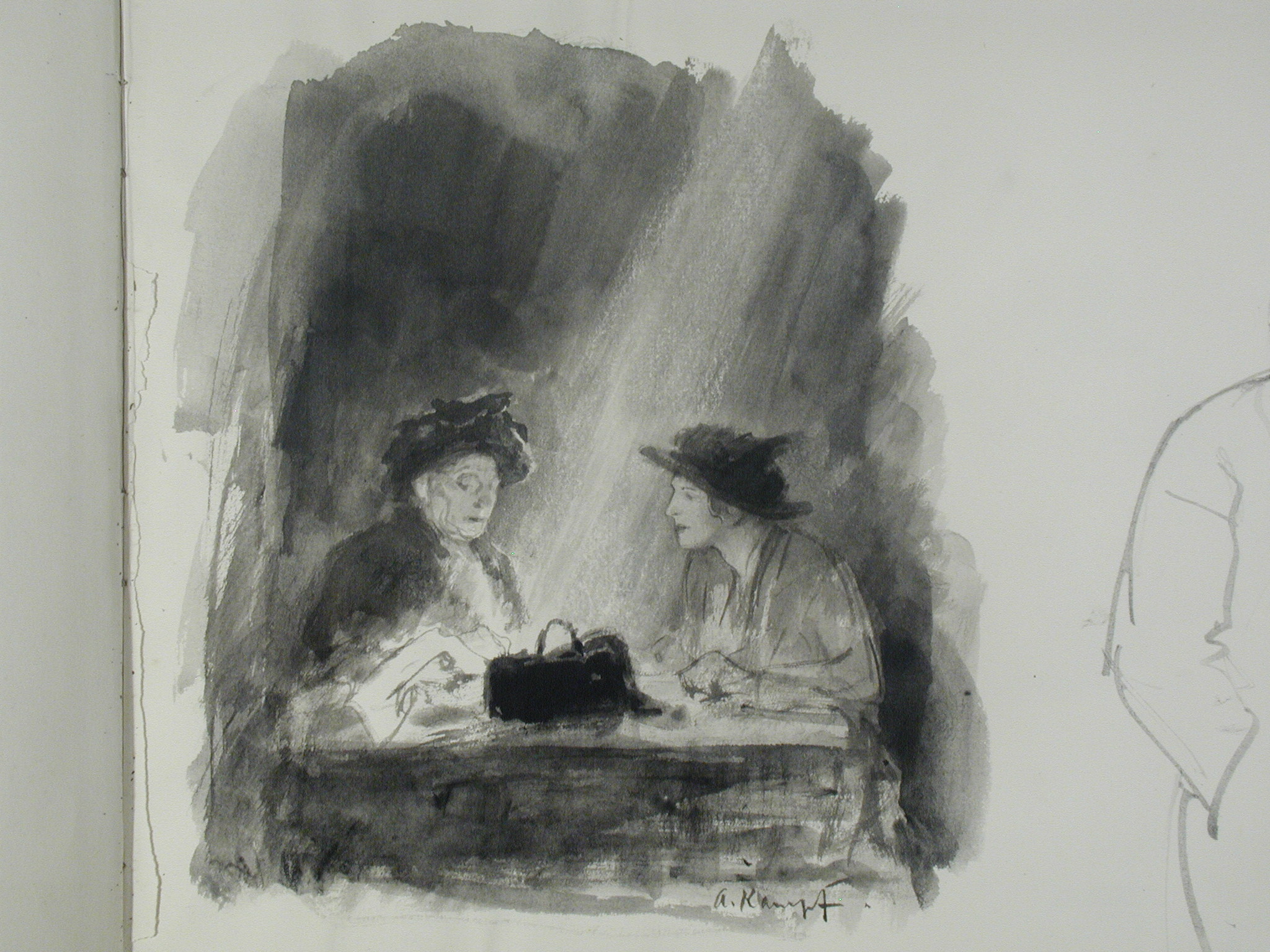 Кількість: 1/Опис: Дві жінки, що сидять за столом. Зображені ліворуч. Унизу авторський підпис. Праворуч - начерк чоловічої фігури в пальто і шапці.