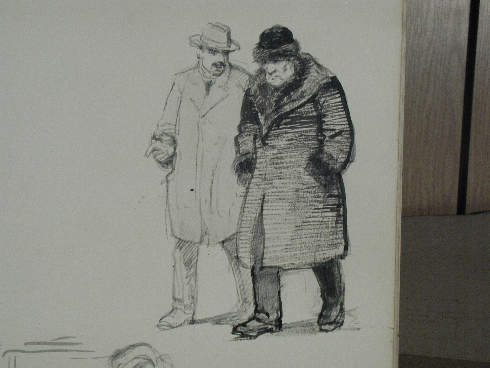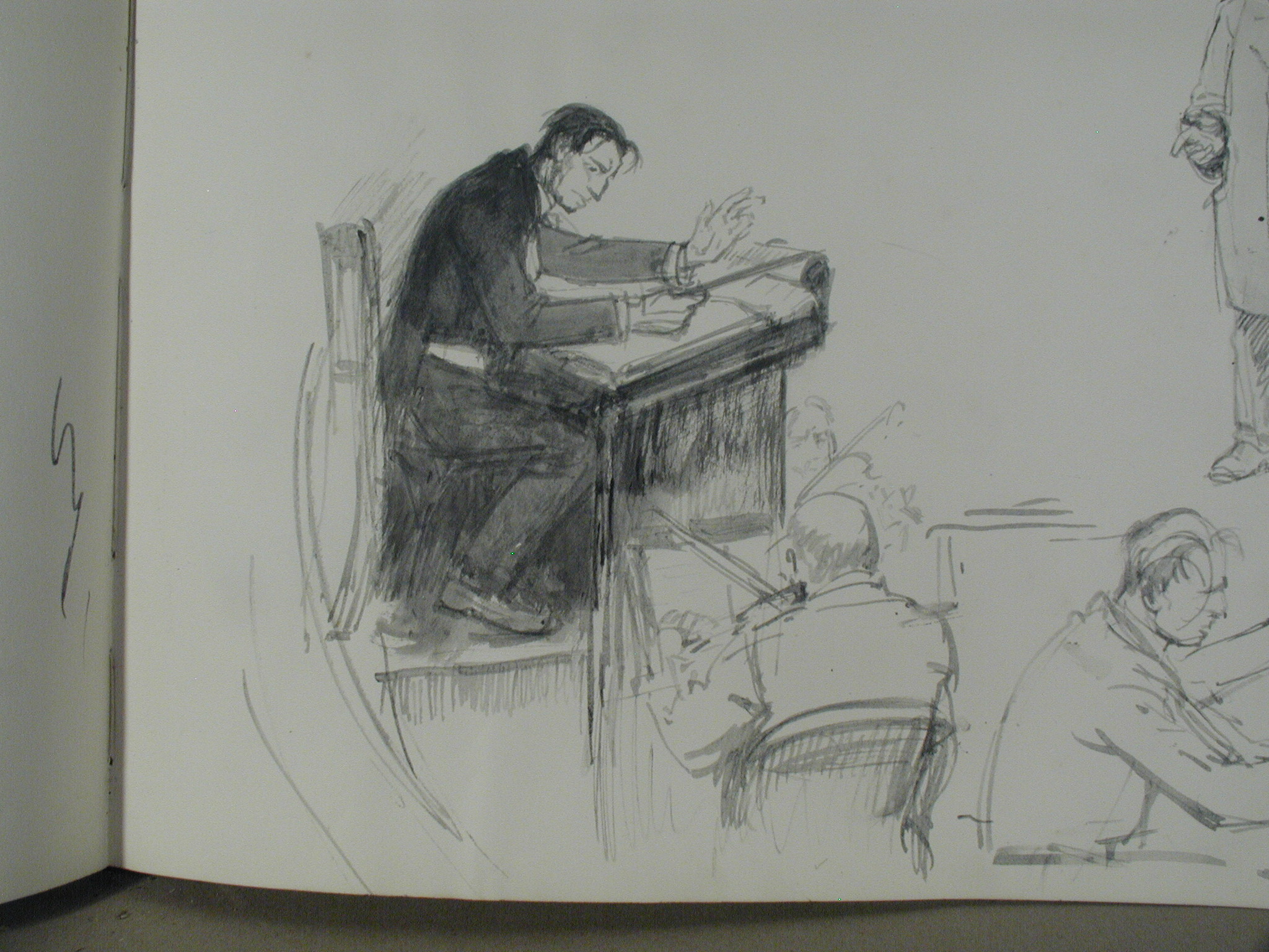 Кількість: 1/Опис: Чотири різних начерки. Ліворуч - диригент, що сидить за пультом. Праворуч - двоє чоловіків.